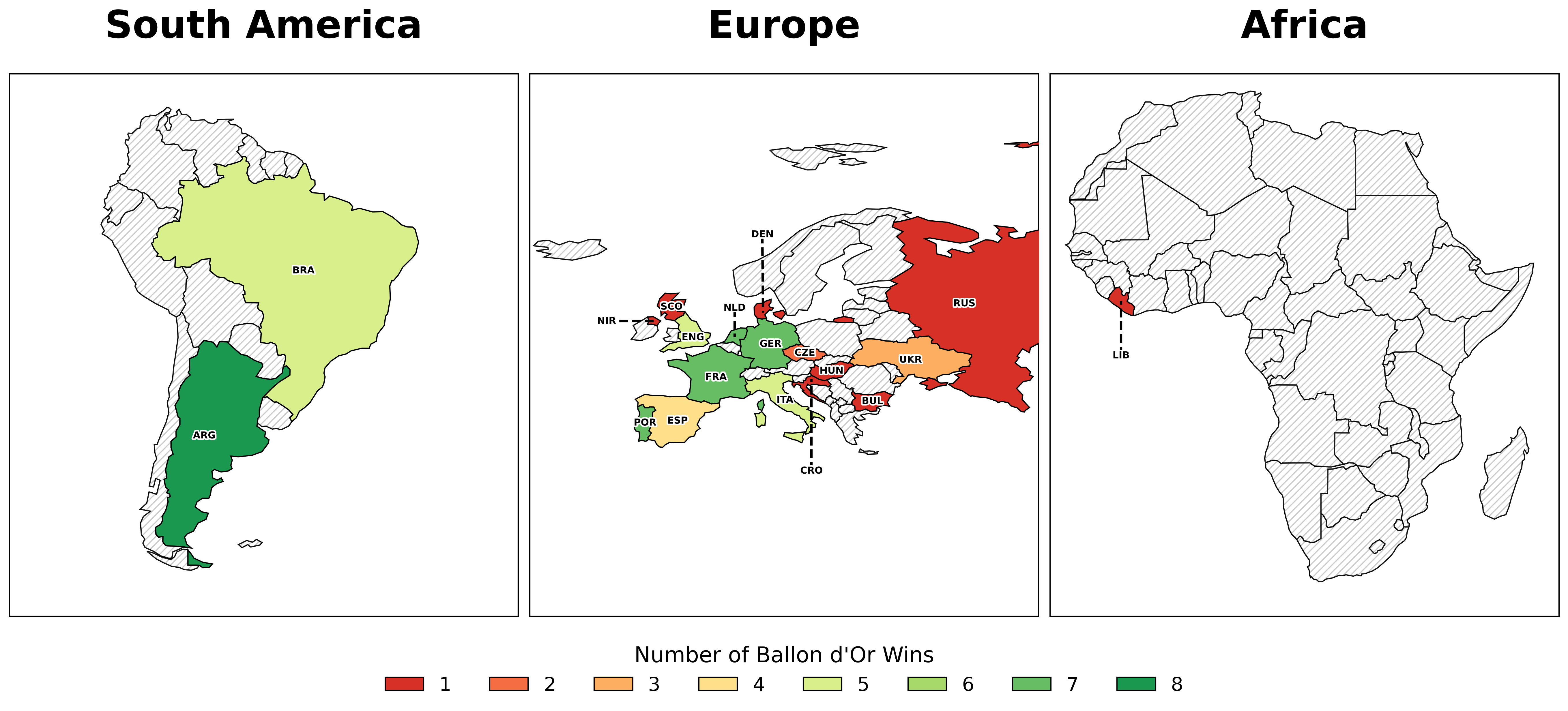 What if they had a different nationality? Suppose Messi was an Australian. Suddenly, Argentina would go from the best country to win the award in to the worst, and Australia goes from the worst to the best country.