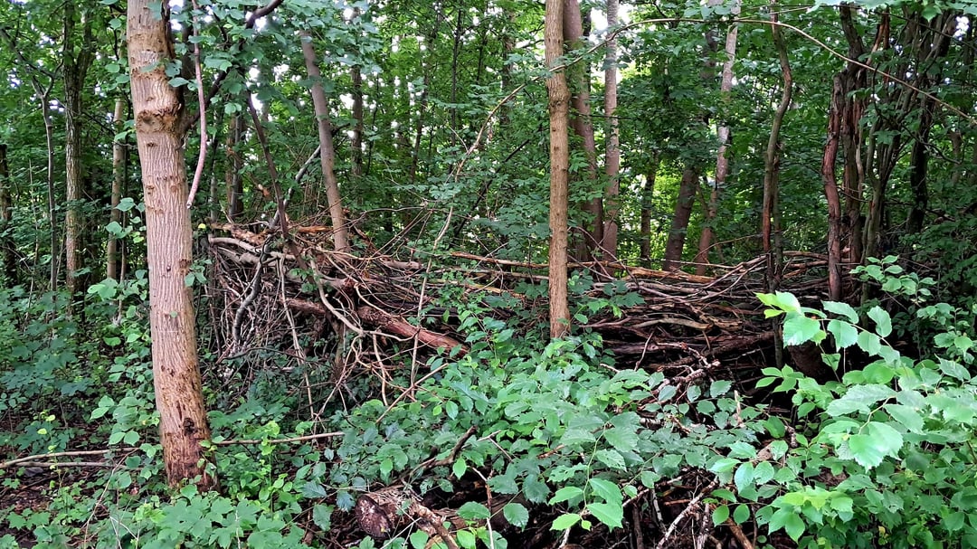 På min weekendtur til min hjemstavn var jeg ude at gå i det område, hvor billederne fra den nu fjernede hule var taget. Der så jeg på den anden side af en grøft en stak nedfaldne træer og grene stablet oven på hinanden, hvilket jeg umiddelbart ikke tillagde nogen stor betydning. Kommunens folk plejer nemlig at opskære og stable nedfaldne træer og grene fra stisystemerne og lægge dem ud i træbevoksningen, så det kan gøre nytte for områdets dyr i stedet for blot at ligge i vejen. Dog lagde jeg hurtigt mærke til, at grenene ikke blot var stablet men nærmest flettet sammen som et slags primitivt hegn eller mur. Det lignede derfor ikke den typiske bunke grene og opskårede træer i området men begyndelsen på en type hule, som jeg havde set før i området.
