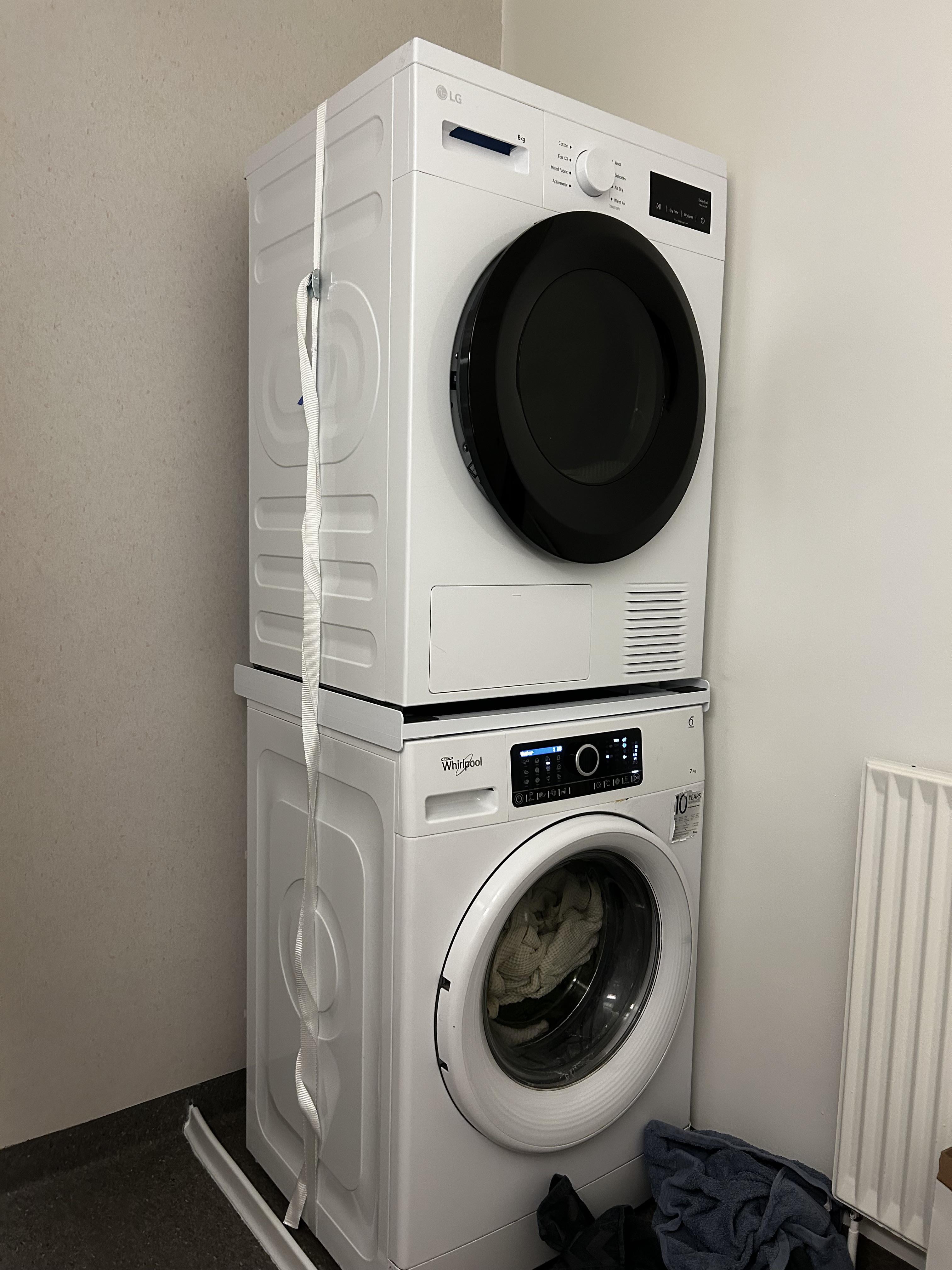 Du stiller maskiner oven på hinanden (selvfølgelig tørretumbler øverst) – sådan som de skal stå for at se godt ud ..