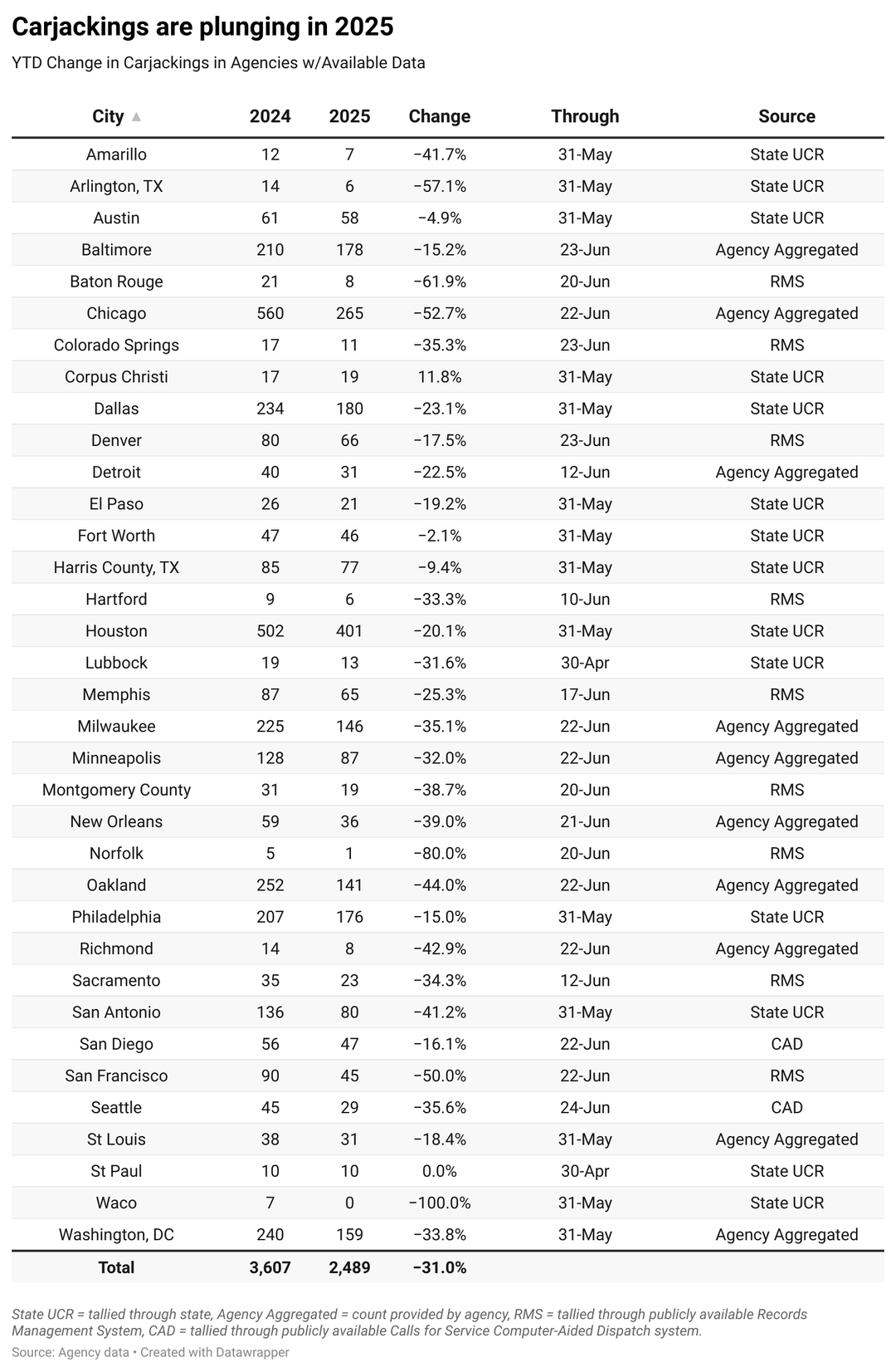 Carjackings exploded nationwide between 2020 and 2022 but fell the last two years. Data from cities and states that publish it shows the plunge is continuing even faster through around midyear this year.