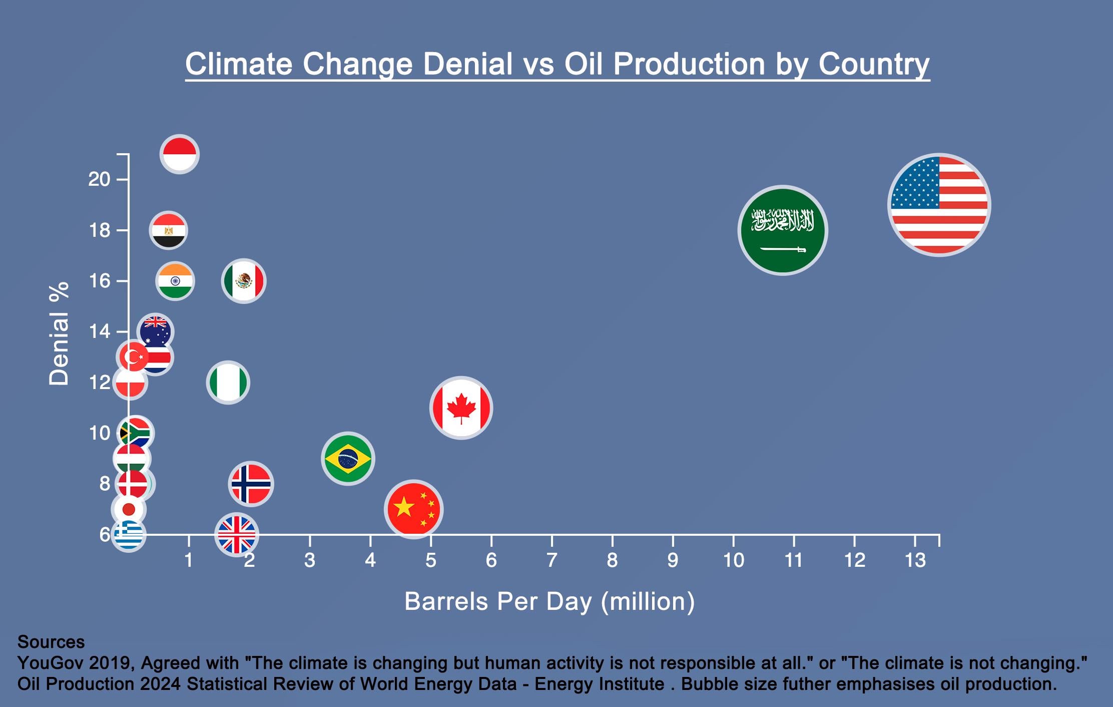 The graph you have only really proves that the US and Saudi Arabia both are disproportionately oil producing and climate denying which is a small enough sample to be considered a coincidence, especially with all the non oil producing, yet climate denying countries