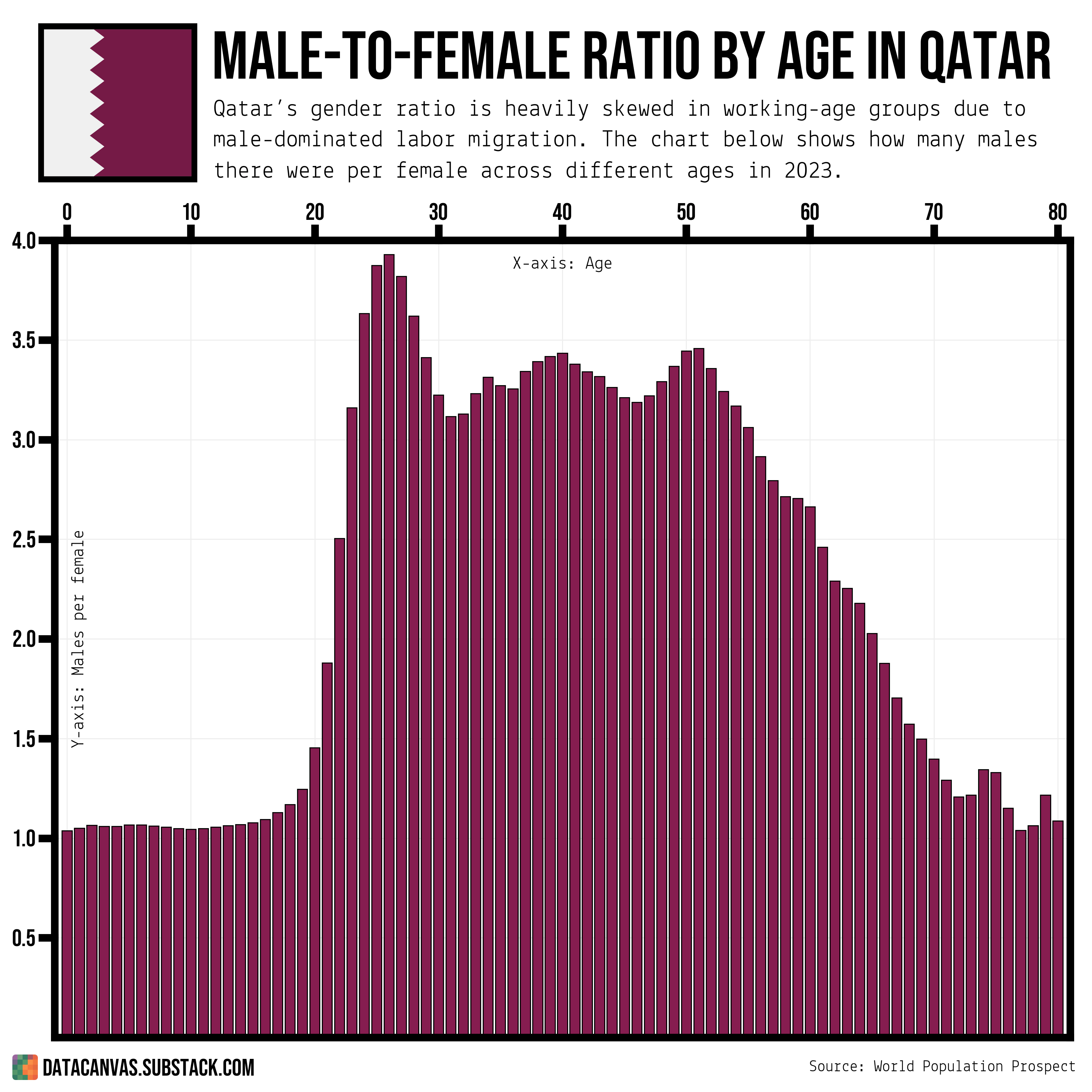 UAE has very skewed gender ratio for this reason as well. It’s intereseting that abundance of migrant workers also affects their calculated fertility rate as well. Migrant workers are predominantly male, but there’s a lot of female too. So UAE average fertility rate that looks “below replacement level” is actually a combination of 1 child per immigrant woman and 3 per Emirati national.