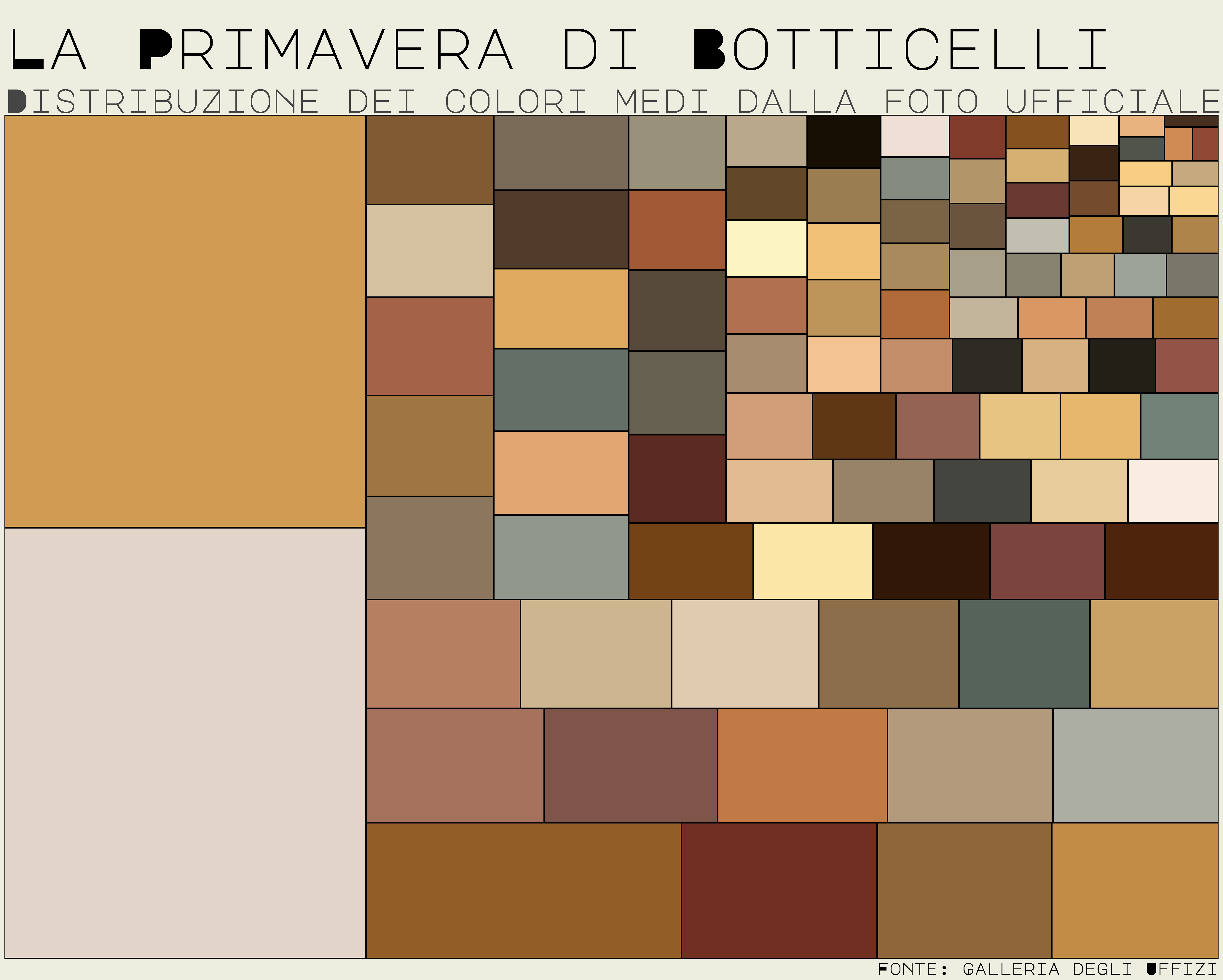 This is a ggplot2 chart created after clustering a picture of Botticelli's Primavera (Uffizi Gallery, Florence, Italy). The results come after identifying clusters in the color space. This (printed) chart will be exhibited from Saturday in an art gallery in Massa Marittima, Italy; you can read more here: