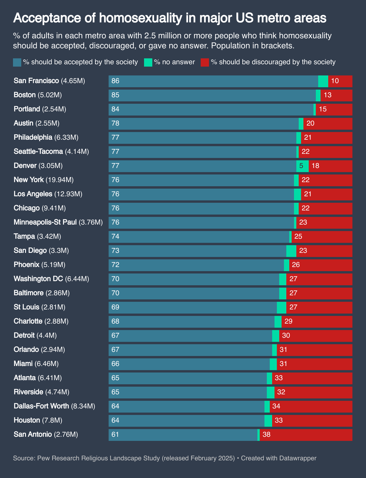 32. A clear majority indicating that being gay is ok, in pretty much every US Metro area.