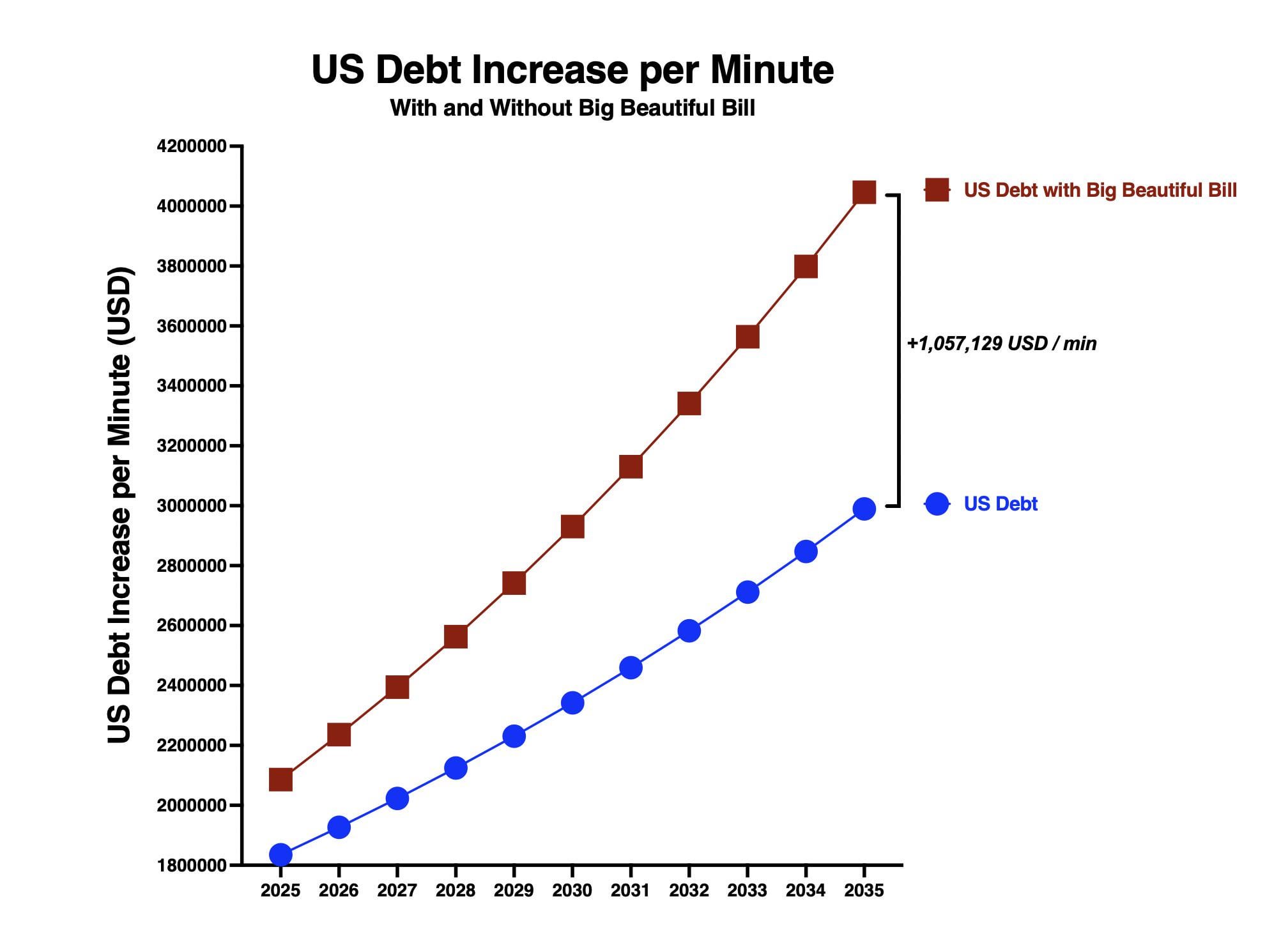 Using the deficit increase from the Big Beautiful Bill and the debt increase timestamps from the bill itself I’ve plotted the rate change of debt just from interest accumulation per minute through the next 10 years. One major assumption made is that US credit rating is not downgraded, which appears to be less likely than before.
