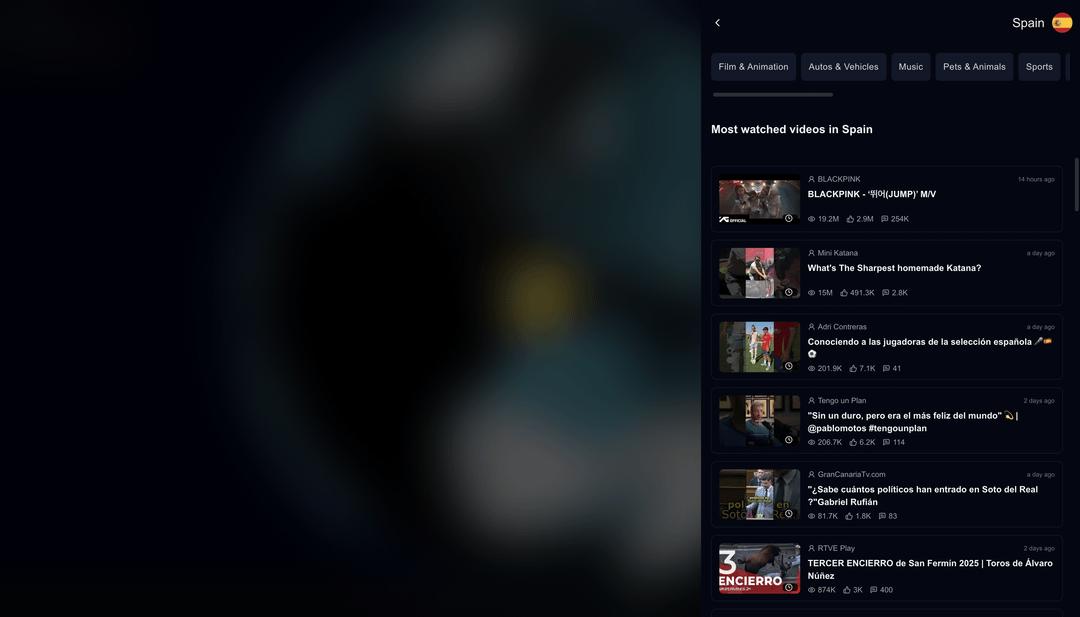Hey everyone! I built a fun little side project over the past week. It’s a cool way to explore what people are watching around the world, whether it’s music in Colombia, trending news in Kenya, or comedy in Japan. Let me know what you think or if you have ideas for features!