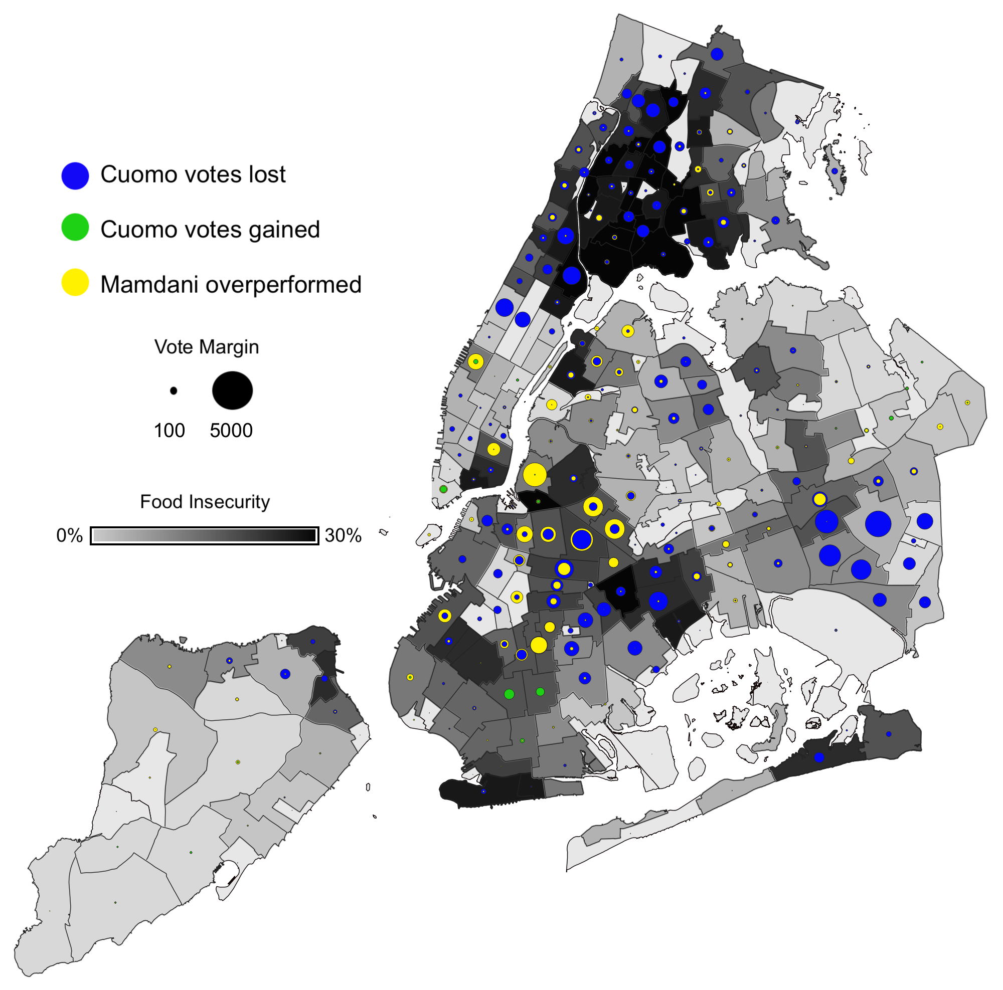 Andrew Cuomo’s Gained and Lost Votes between 2018 & 2025 vs. Zohran Mamdani’s 2025 Vote Margin over Cuomo’s 2018 Challenger. The size of dark blue bubbles reflects the number of votes Cuomo lost, and green bubbles reflect votes he gained, in that neighborhood in 2025 relative to his performance in 2018. Yellow bubbles reflect the number of votes Mamdani earned over and above the total Cuomo’s challenger, Cynthia Nixon, earned in 2018. Light grey neighborhoods have the lowest rates of food insecurity. Dark grey neighborhoods have the highest rate of food insecurity.