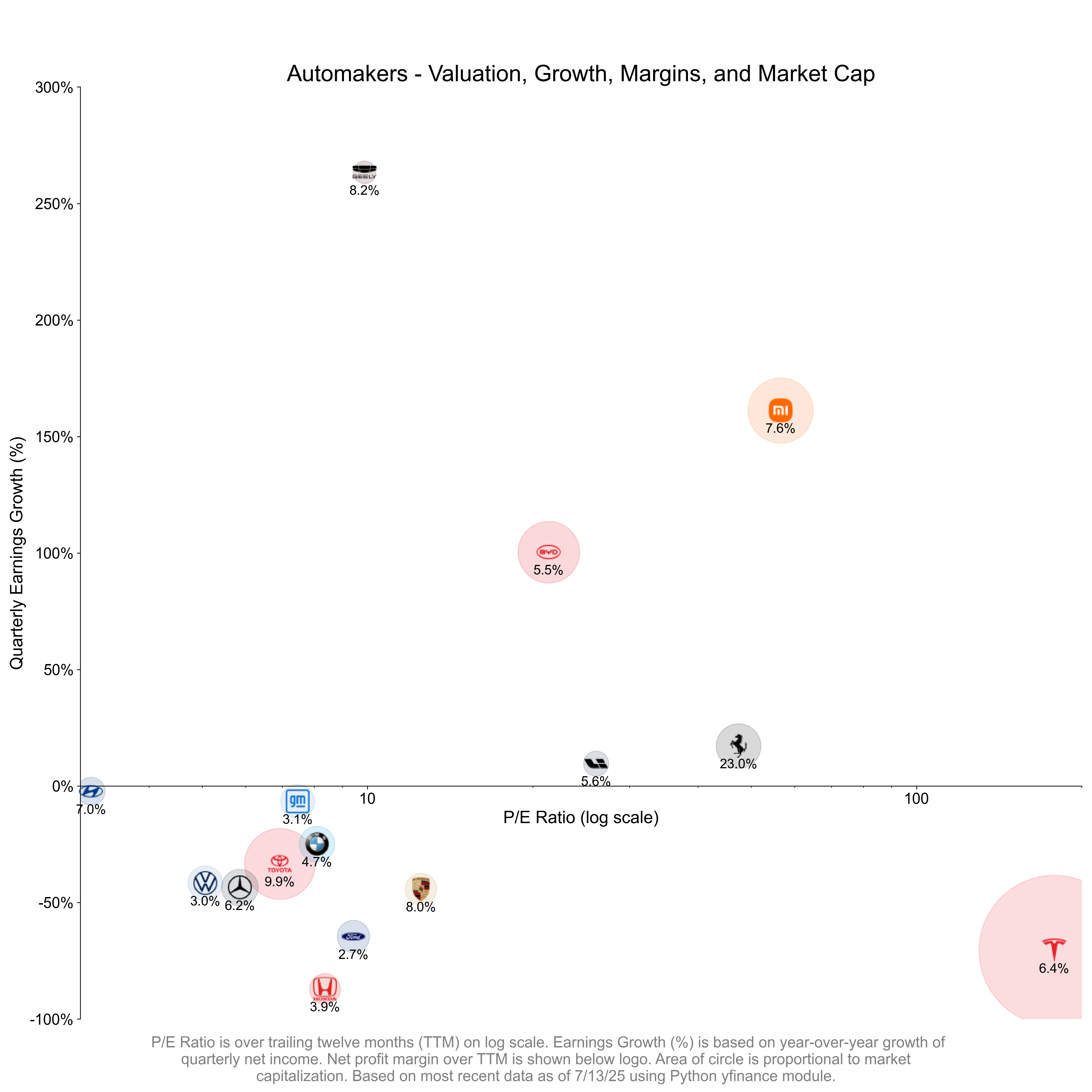 In order to get them to fit on the same graph, I had to use a logarithmic scale on the x-axis because the P/E ratio goes from 3.14 for Hyundai to 178.13 for Tesla. Growth rates vary quite a bit, with most of the legacy automakers in decline. The Chinese EV industry is doing much better, while once-dominant Tesla is rapidly conceding its early lead; smaller US competitors like Rivian and Lucid are hurting even more. Margins are pretty similar for all automakers, legacy and EV alike, with the exception of luxury automaker Ferrari which stands out.