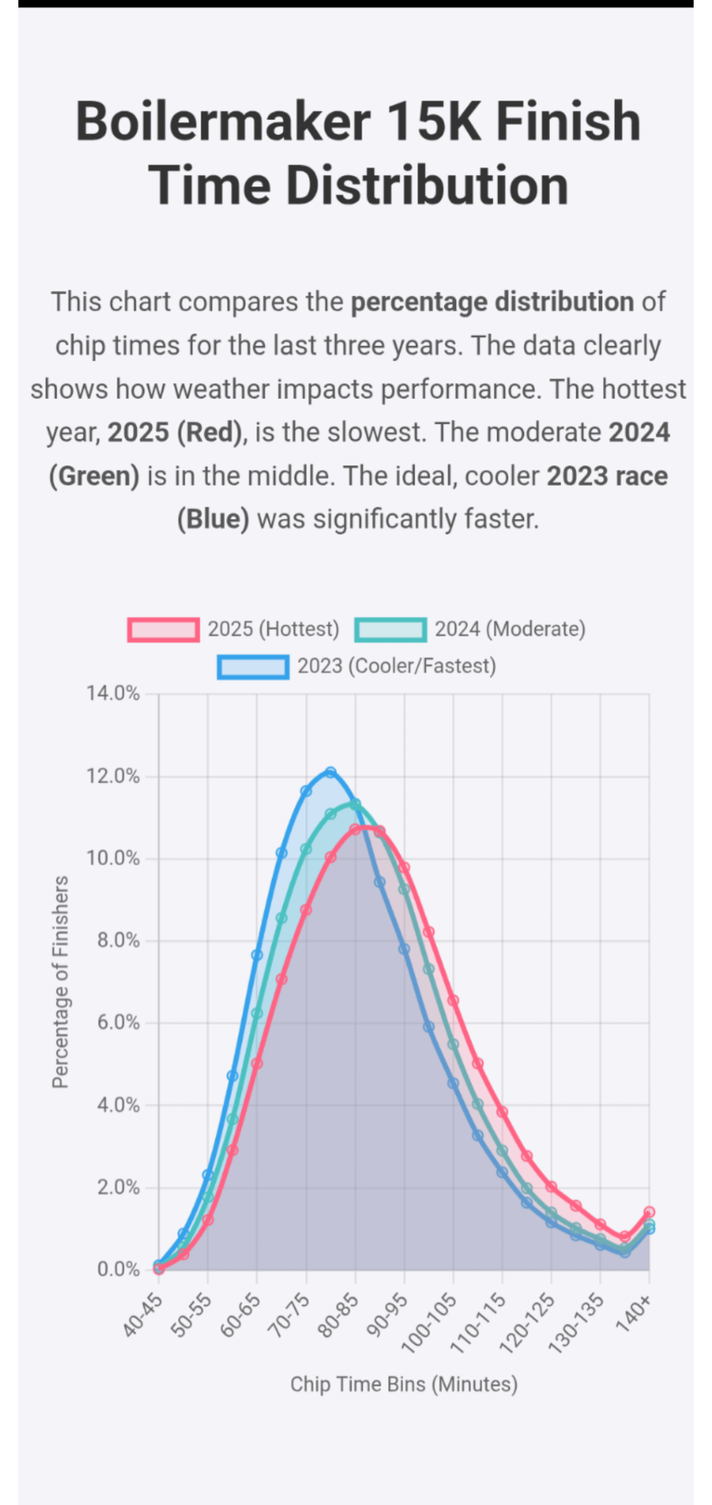 I had Gemini analyze the chip finish times for 8000+ runners each year over the last three, progressively hotter, years