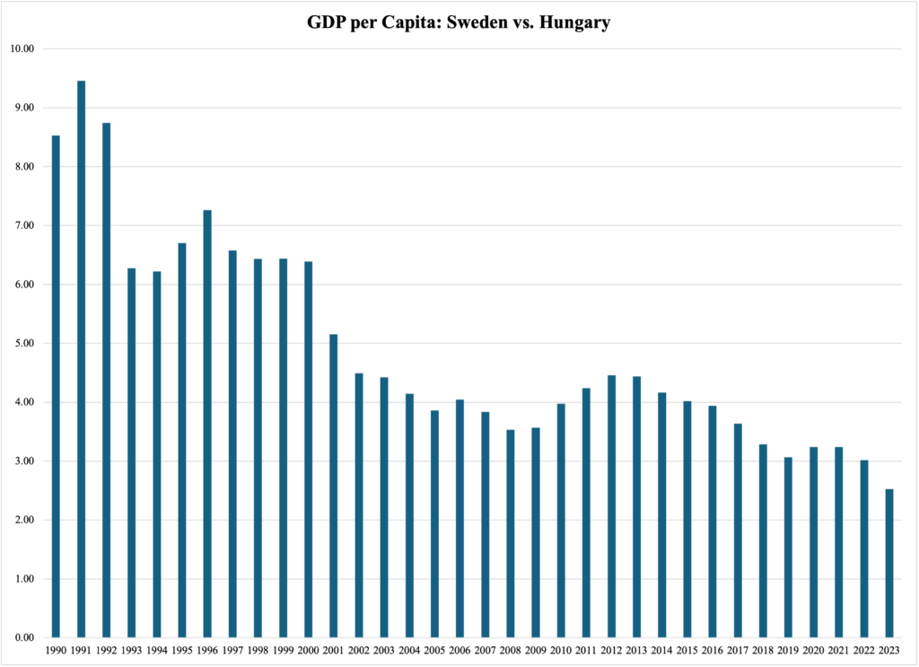 It worked. Once the aftermath of the 2008-2010 recession was over, the future-focused conservative government in Budapest took the nation’s economy to a whole new level. Figure 2 divides the Swedish GDP per capita with the Hungarian equivalent, both measured in the same currency (U.S. dollars). In 1990, Sweden had a GDP per capita of $30,551, while Hungary was at $3,583; the Swedish one was 8.5 times bigger. Fast forward to 2023, the Swedish GDP per capita was only 2.5 times the Hungarian one: