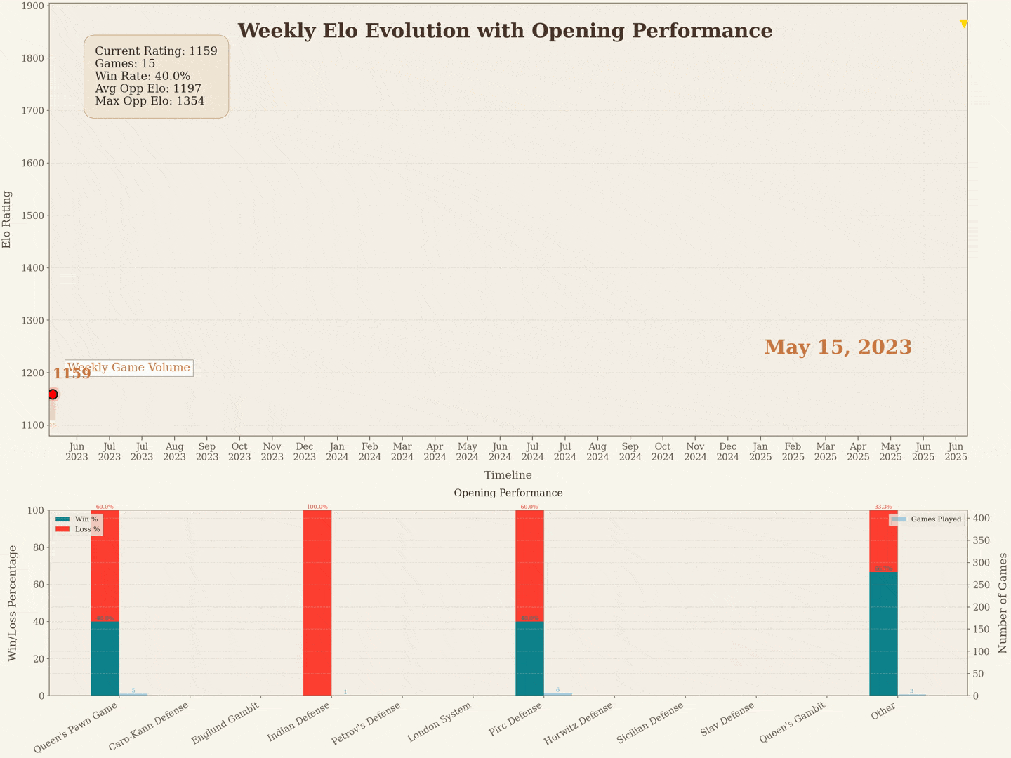 [OC] Visualization of my Chess Elo progression from 2023 to July 2025 in Lichess, with opening win/loss stats over time.