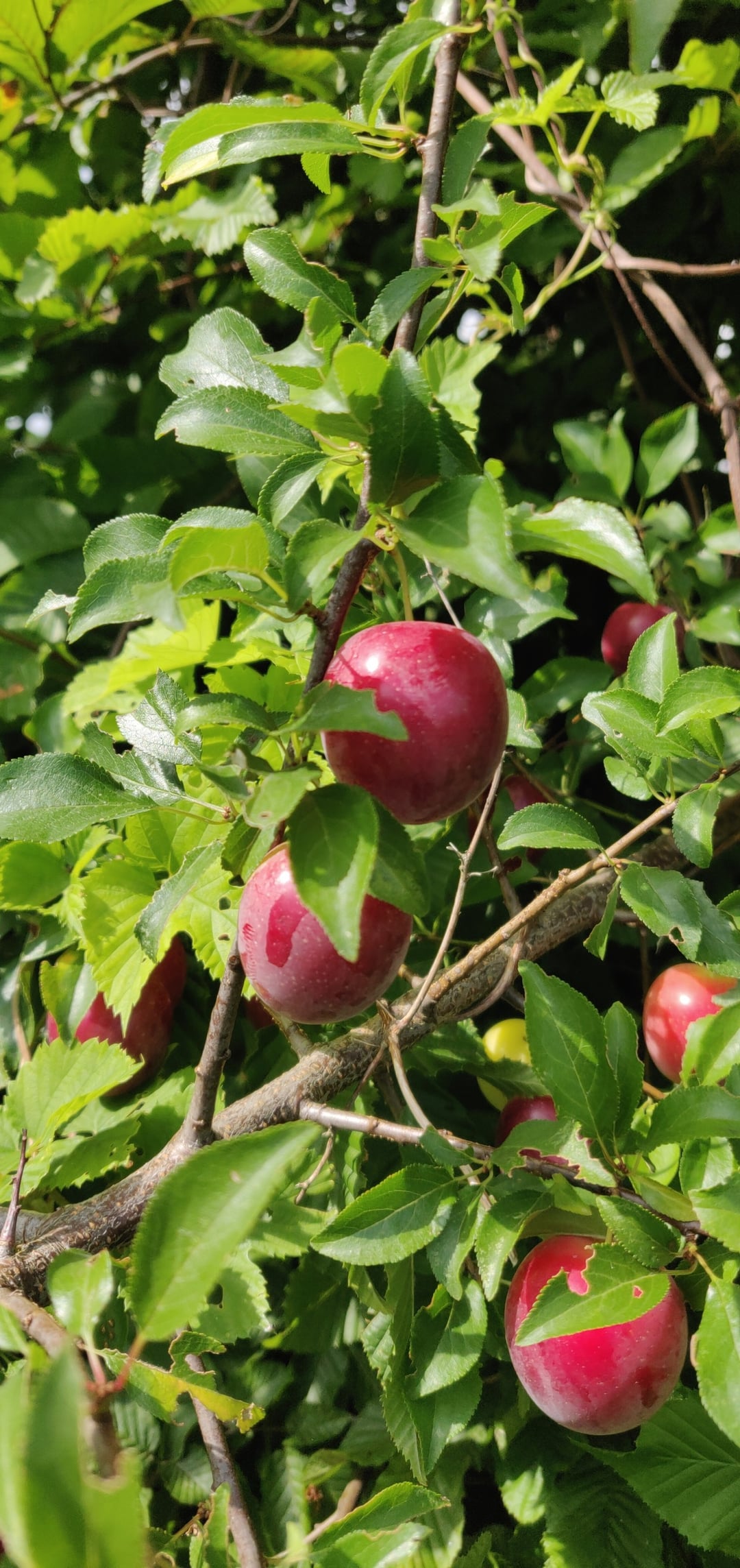 Kirschpflaume, das ist im Grunde einfach eine pigmentierte wilde Mirabelle. Die Früchte und der Wuchs dieser Wildlinge sind oft sehr unterschiedlich. Manchmal sind sie sauer, manchmal mehlig, manchmal lässt sich der Kern nicht gut vom Fleisch trennen. Ab und zu ist aber ein guter Baum dabei.