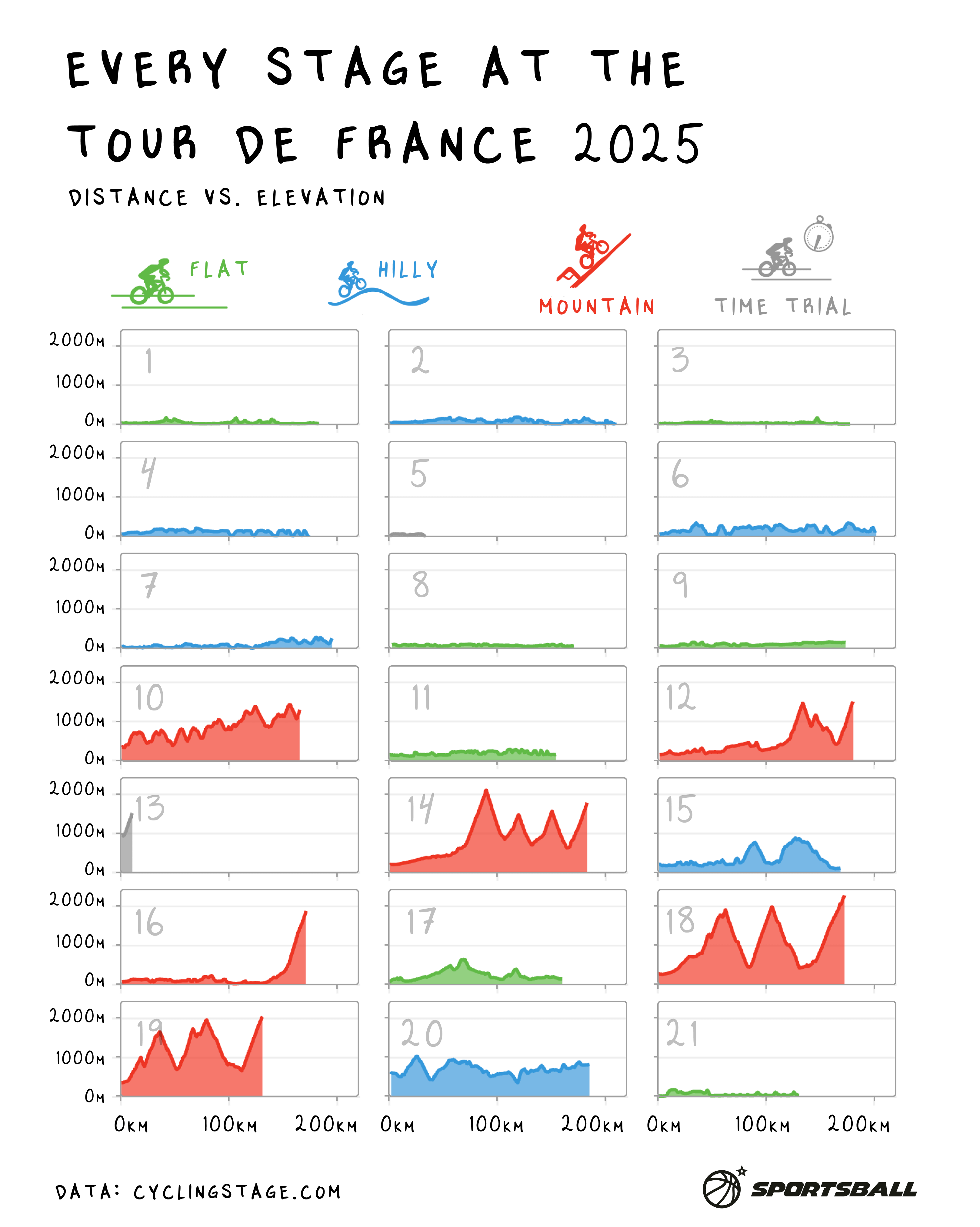 Each stage of this year's Tour de France with elevation gain and total distance normalized across all charts. Data from cyclingstages.com gpx files and created in Excel. Original post from SportsBall at https://www.instagram.com/p/DMLp7IgTtGB/?hl=en&img_index=1