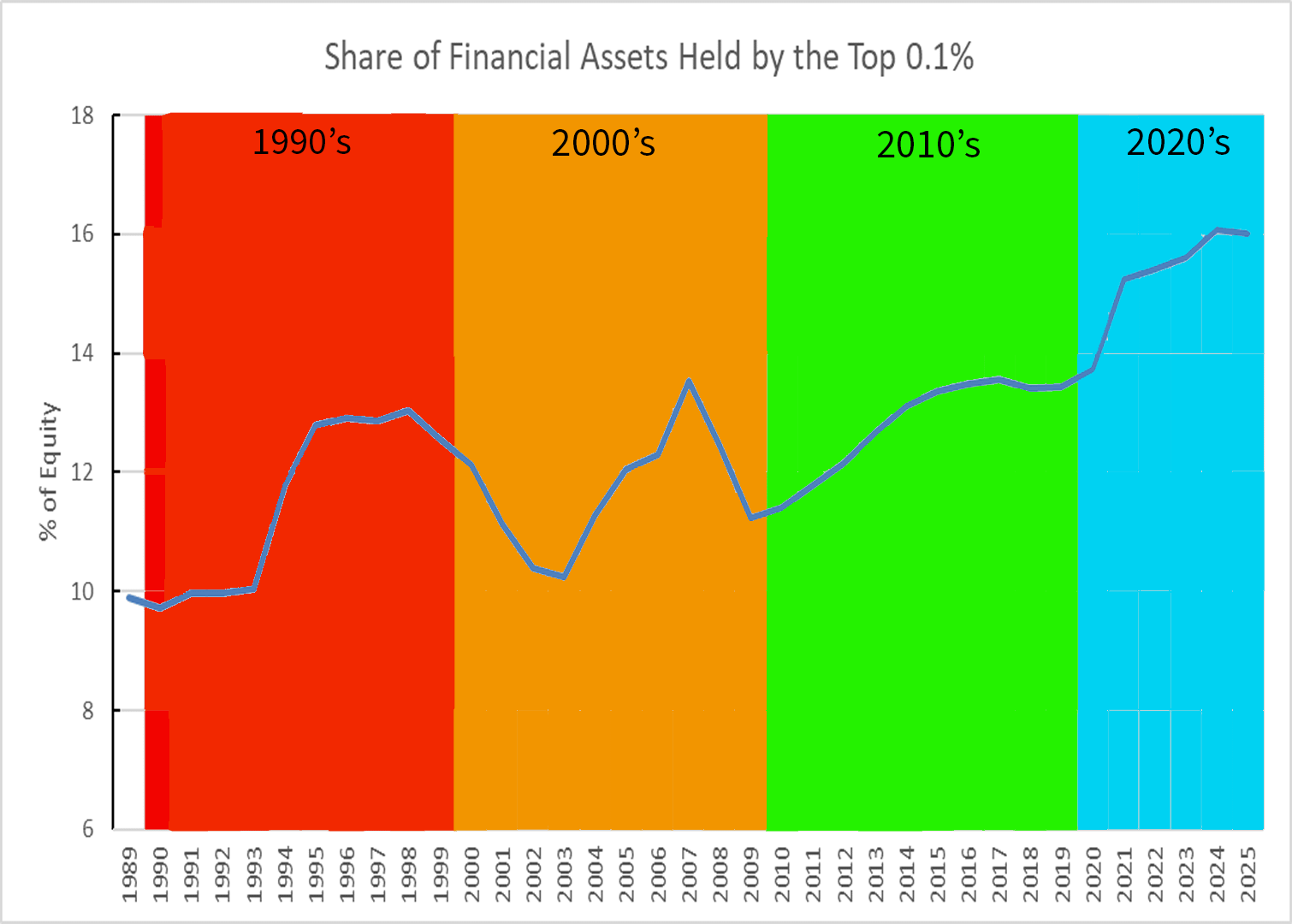 Board of Governors of the Federal Reserve System (US), Share of Financial Assets Held by the Top 0.1% (99.9th to 100th Wealth Percentiles) [WFRBSTP1291], retrieved from FRED, Federal Reserve Bank of St. Louis; https://fred.stlouisfed.org/series/WFRBSTP1291, July 16, 2025.