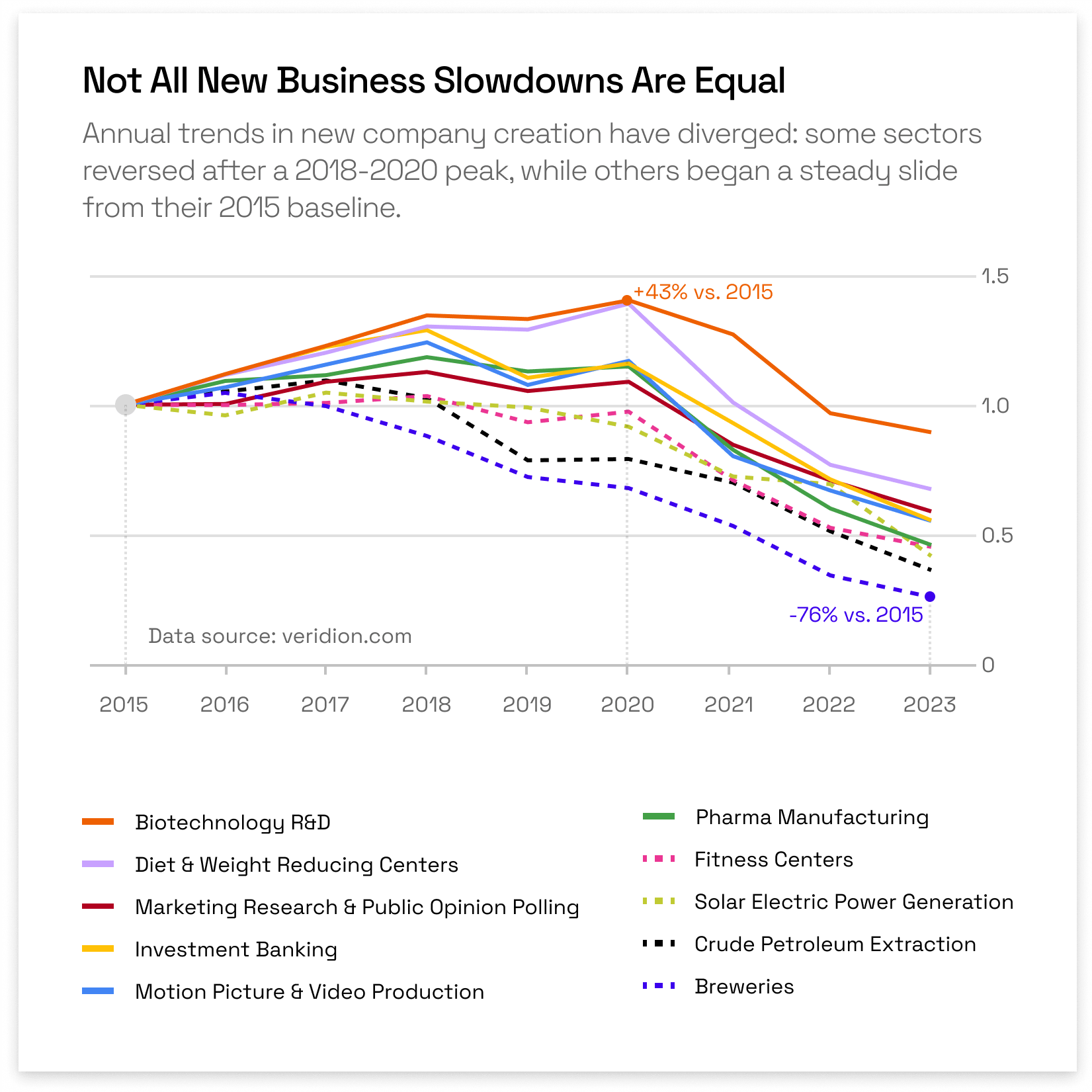 [OC] Industries showing a decline in new companies created each year after 2020