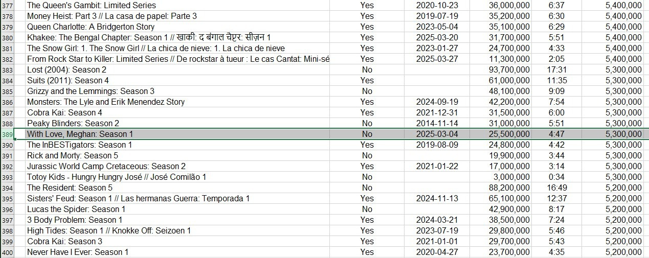 The Netflix ‘Most Watched’ list for the first half of 2025 with ‘With Love, Meghan’ at No. 383