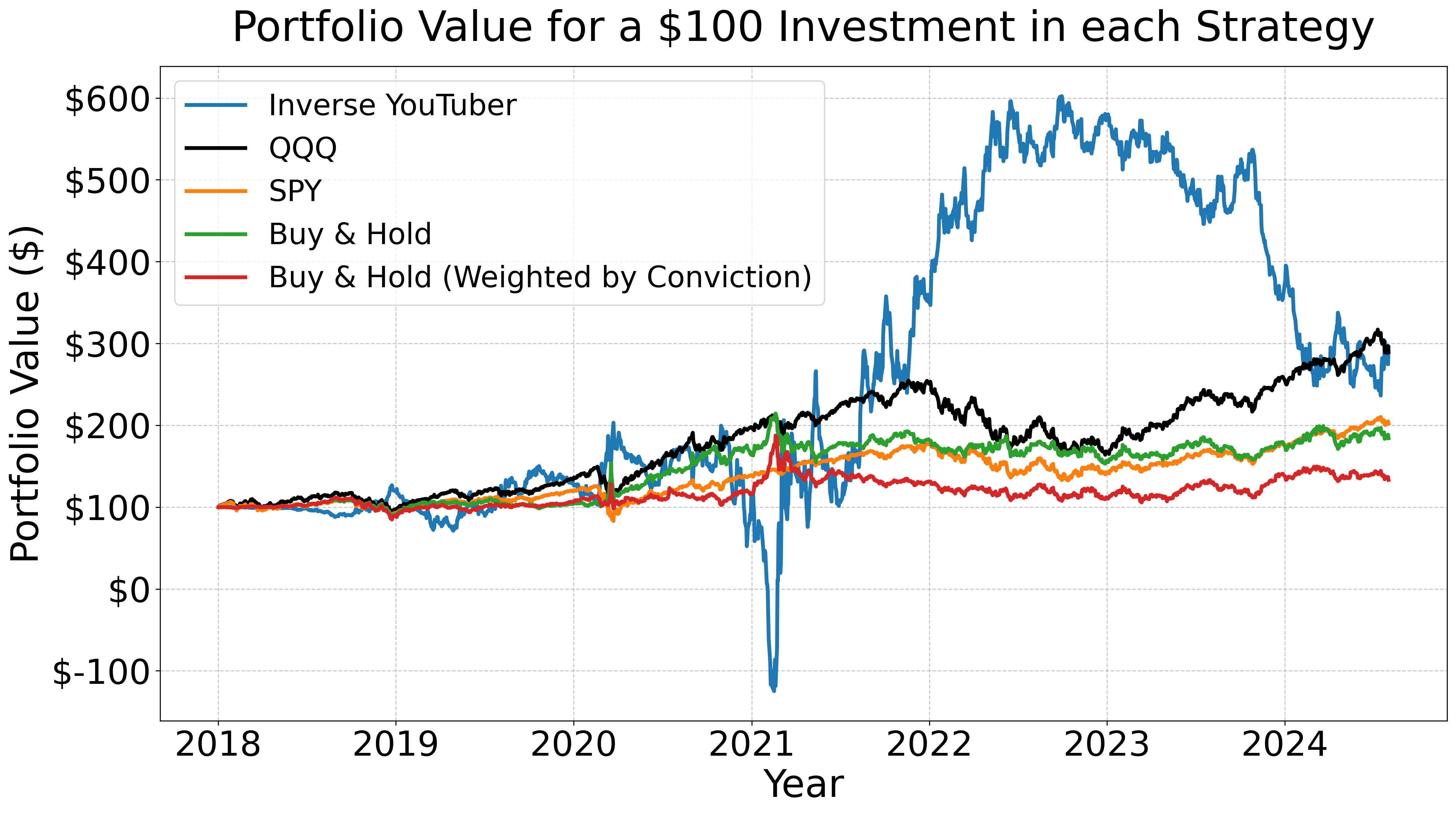 Portfolio value on a $100 investment: The Inverse YouTuber strategy outperforms QQQ and S&P 500, while all other strategies underperform.