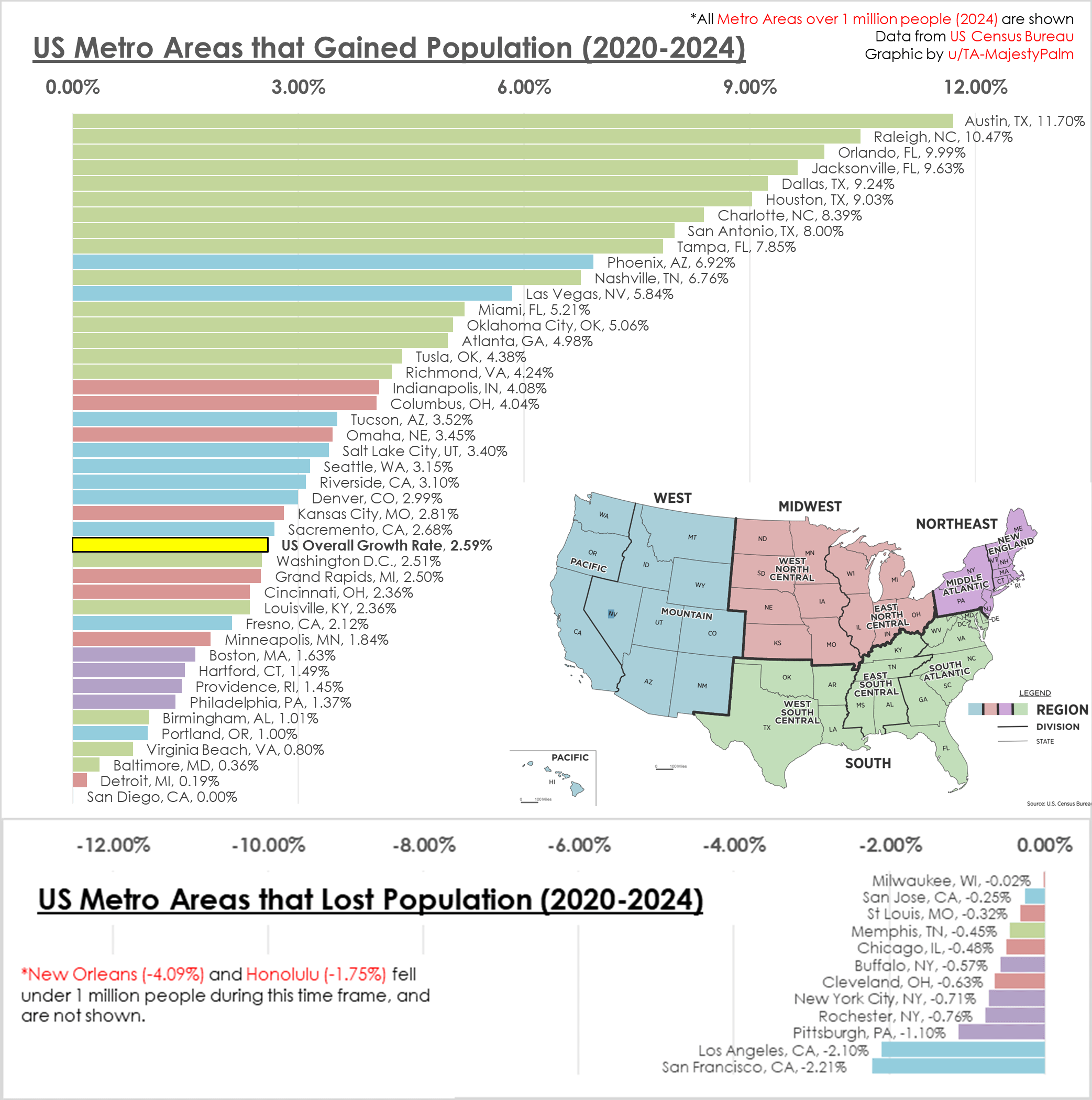 Every Metro Area with a population over 1 million (in 2024) is shown. Bars are color coded based on the US Census bureau region (map shown in graphic).