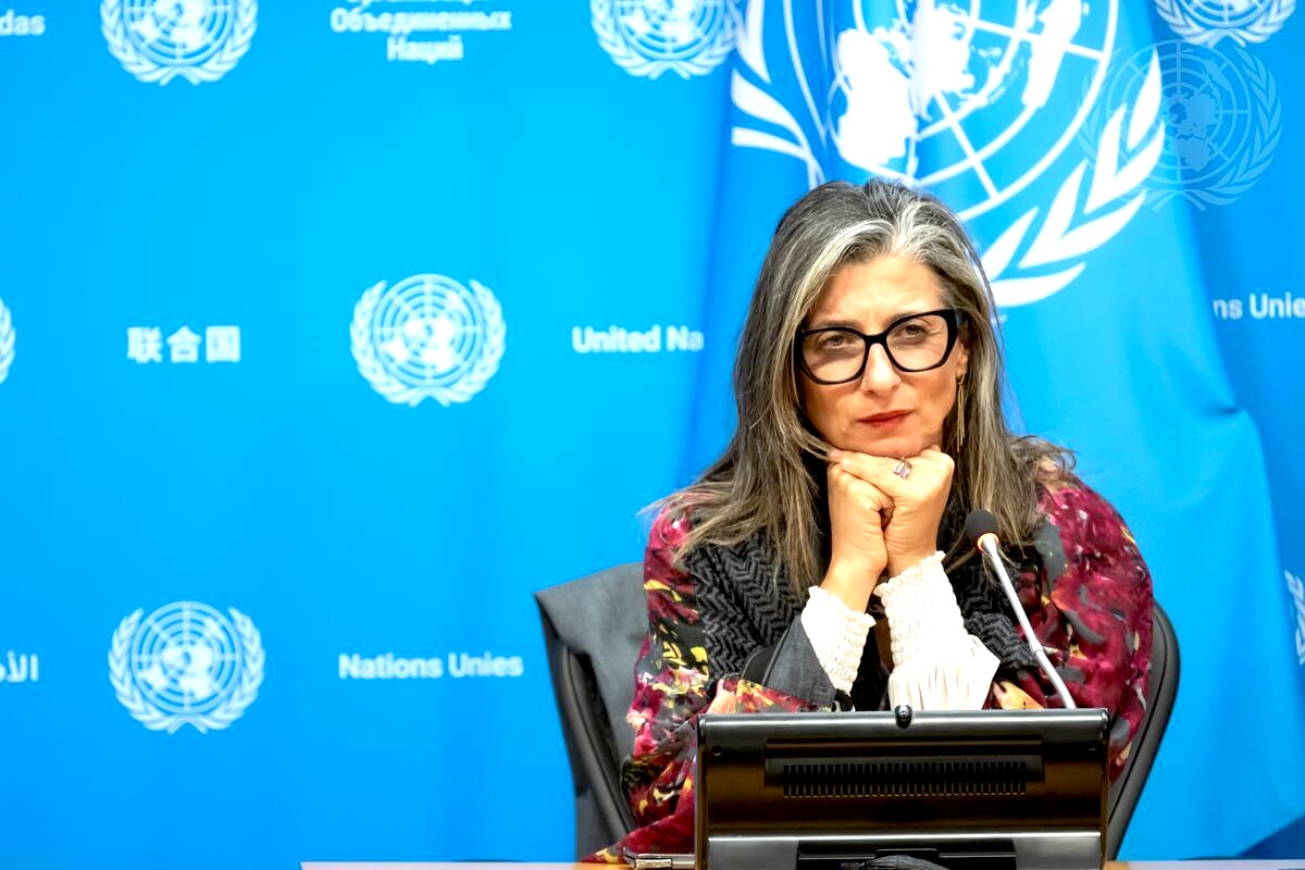 Albanese during a press briefing at U.N. headquarters in New York on Oct. 30, 2024. (UN Photo/Mark Garten)