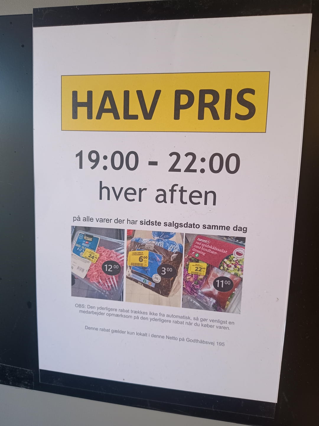 Min lokale Netto (Godthåbsvej 195) giver 50% oveni de varer som er lige ved at ryge. Det er god stil fordi Nettos nedsætningssystem er låst så medarbejderne ikke selv kan vælge prisen (men kan godt rette i kassen).