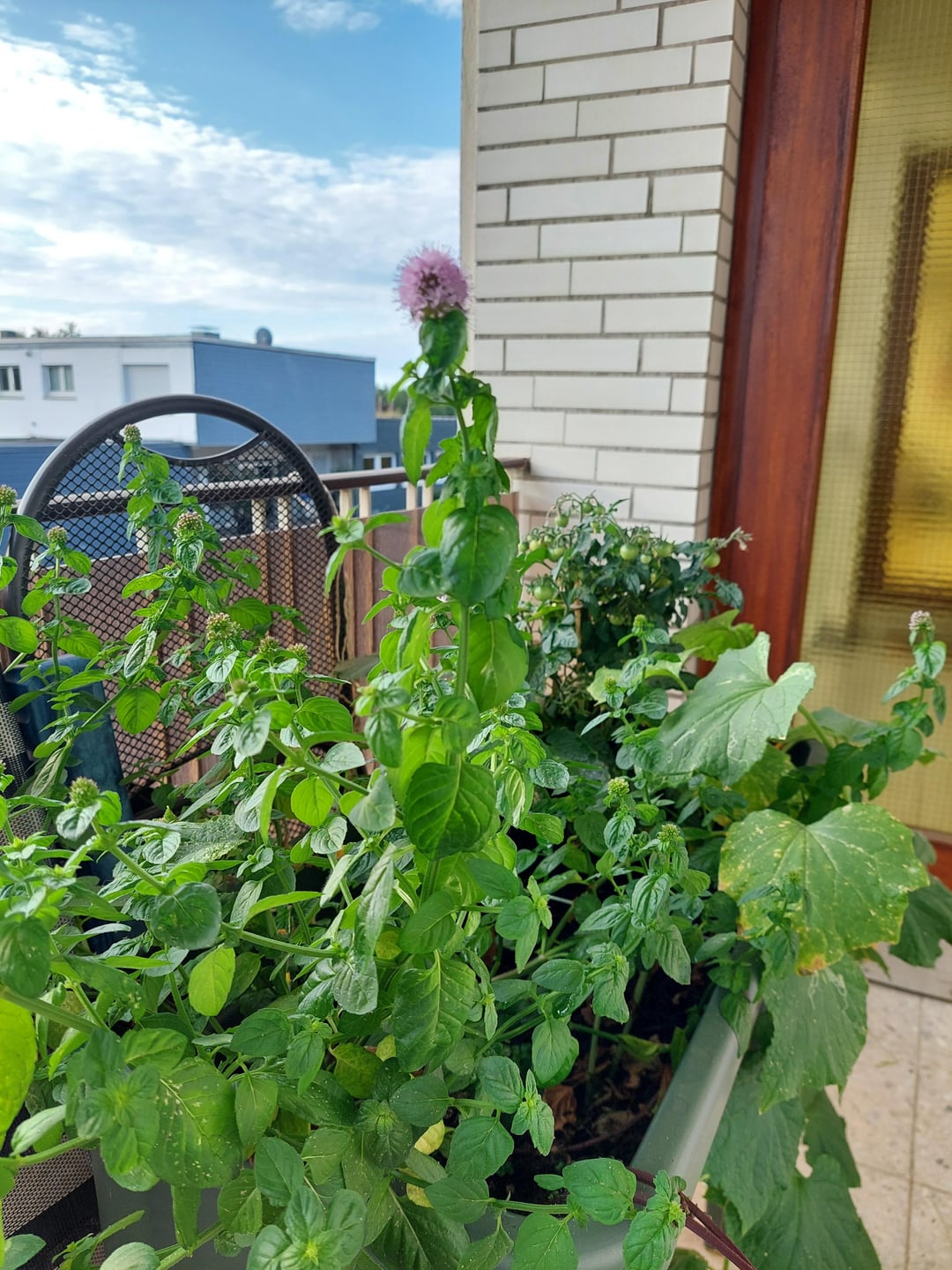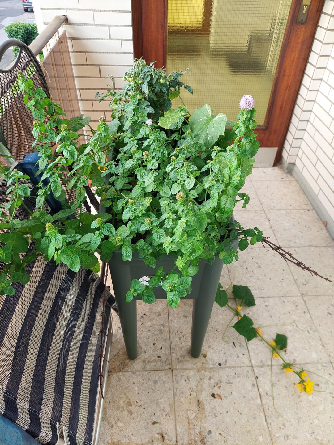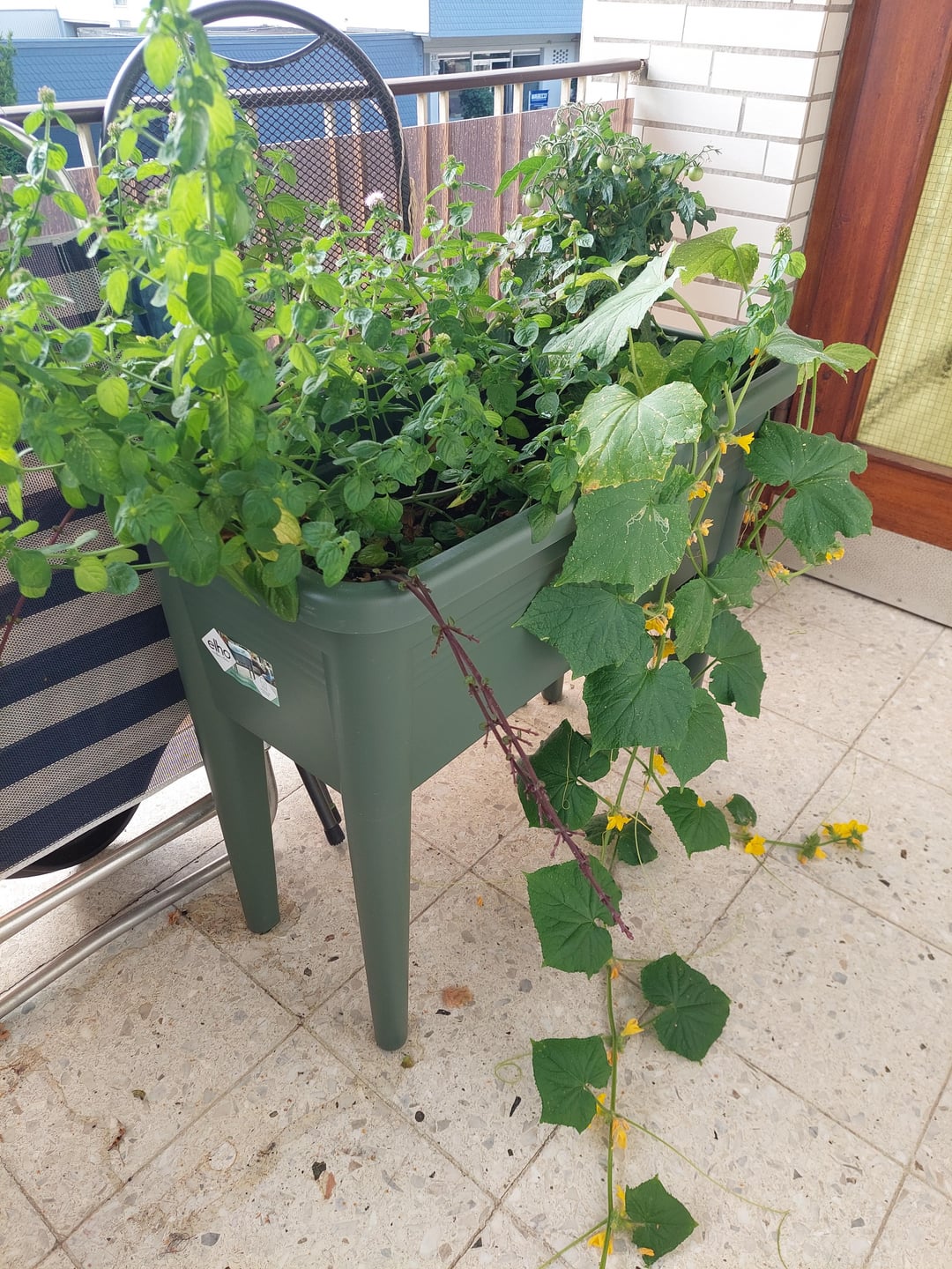 Ich erkenne Minze (links), Mini Tomaten (hinten) und Gurke. Ich bin mir nicht sicher ob das alles ideale Nachbarn sind. Minze kann man gut in Wasser machen für ein bisschen Geschmack oder Tee an kalten Tagen. Gurke hochbinden und die Tomaten düngen.