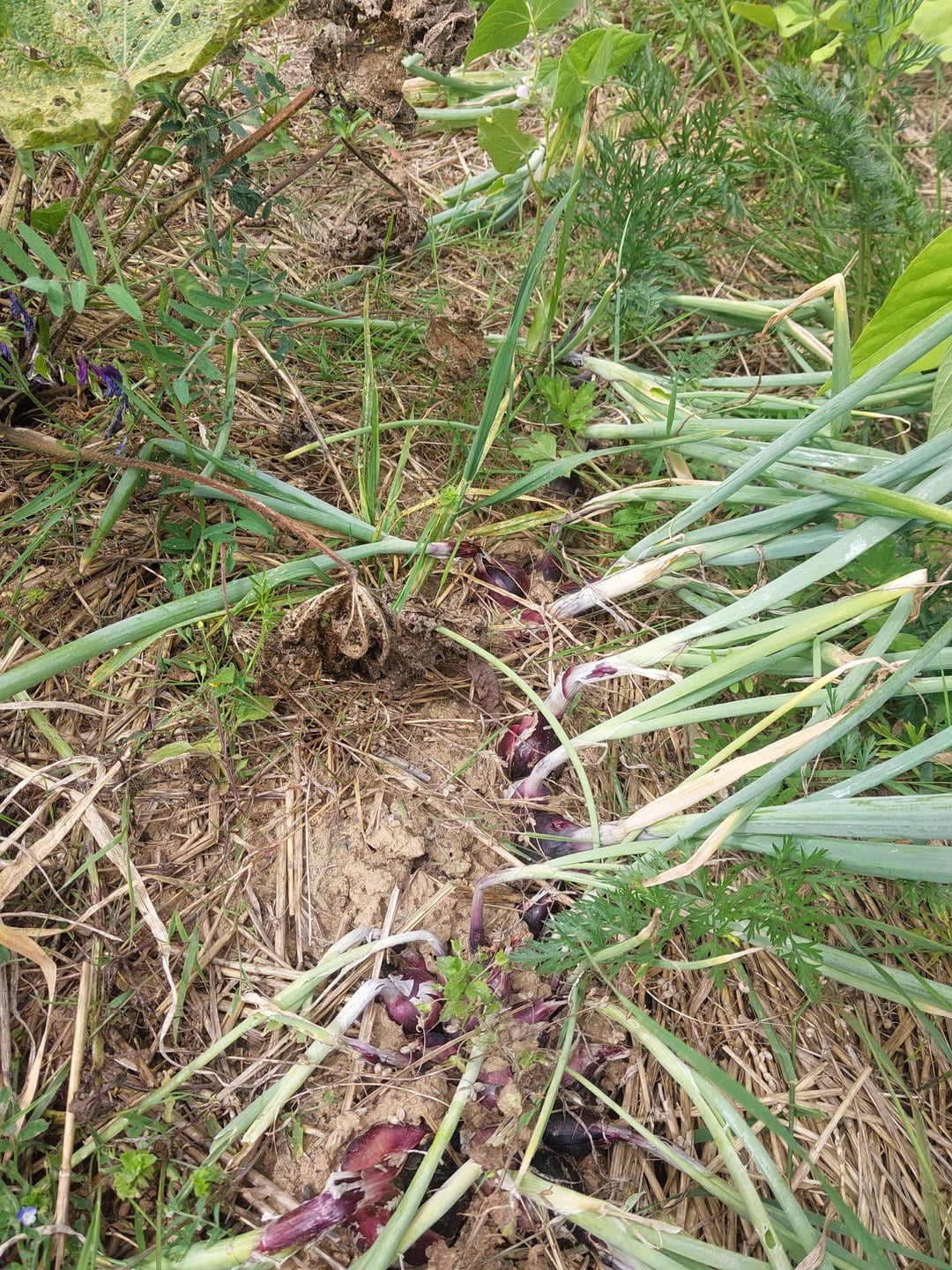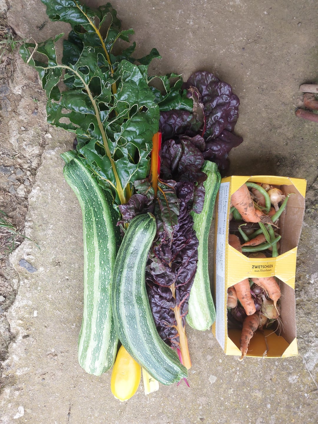 Bei mir tritt ein wenig Atemschöpfen nach dem ersten großen Ernteschub ein: Die Erbsen und Dicken Bohnen habe ich weitgehend gerodet und auch die erste Tranche der Buschbohnen gab heute nicht mehr viel her, während die zweite noch nicht erntereif ist. Die Zucchini und Hokkaido-Kürbisse gehen angesichts des seit ein paar Tagen wieder wärmeren Wetters erst jetzt wieder richtig ins Rennen. An den frühen Kartoffeln ist das Laub jetzt komplett abgestorben, aber da habe ich auch noch eine Menge von letztem Wochenende zu hause rumliegen. Ein oder zwei Wochen lasse ich die restlichen noch in der Erde, um sie dann einzukellern. Bei den Möhren habe ich es weitgehend bei ein paar Noternten belassen, wo Pflanzen oben abgefressen waren. Ähnlich bei den Saatzwiebeln, wo ich diejenigen mit ganz abgestorbenem oder weggefressenen Laub entnommen habe. Die trocknen jetzt auf der Terrasse vor sich hin und kommen als Steckzwiebeln fürs nächste Jahr in den Keller. Nur der Mangold kann fröhlich weiter beerntet werden. Das ist aber ganz gut so, weil zu hause noch rund drei Kilo Zucchini und zwei Hokkaidos von den letzten Wochenenden rumliegen und verarbeitet werden wollen. Immerhin ahbe ich heute die letzten Dicken Bohnen und Erbsen aus dem Kühlschrank verarbeitet, so dass ich ein wenig vor die Lage komme.