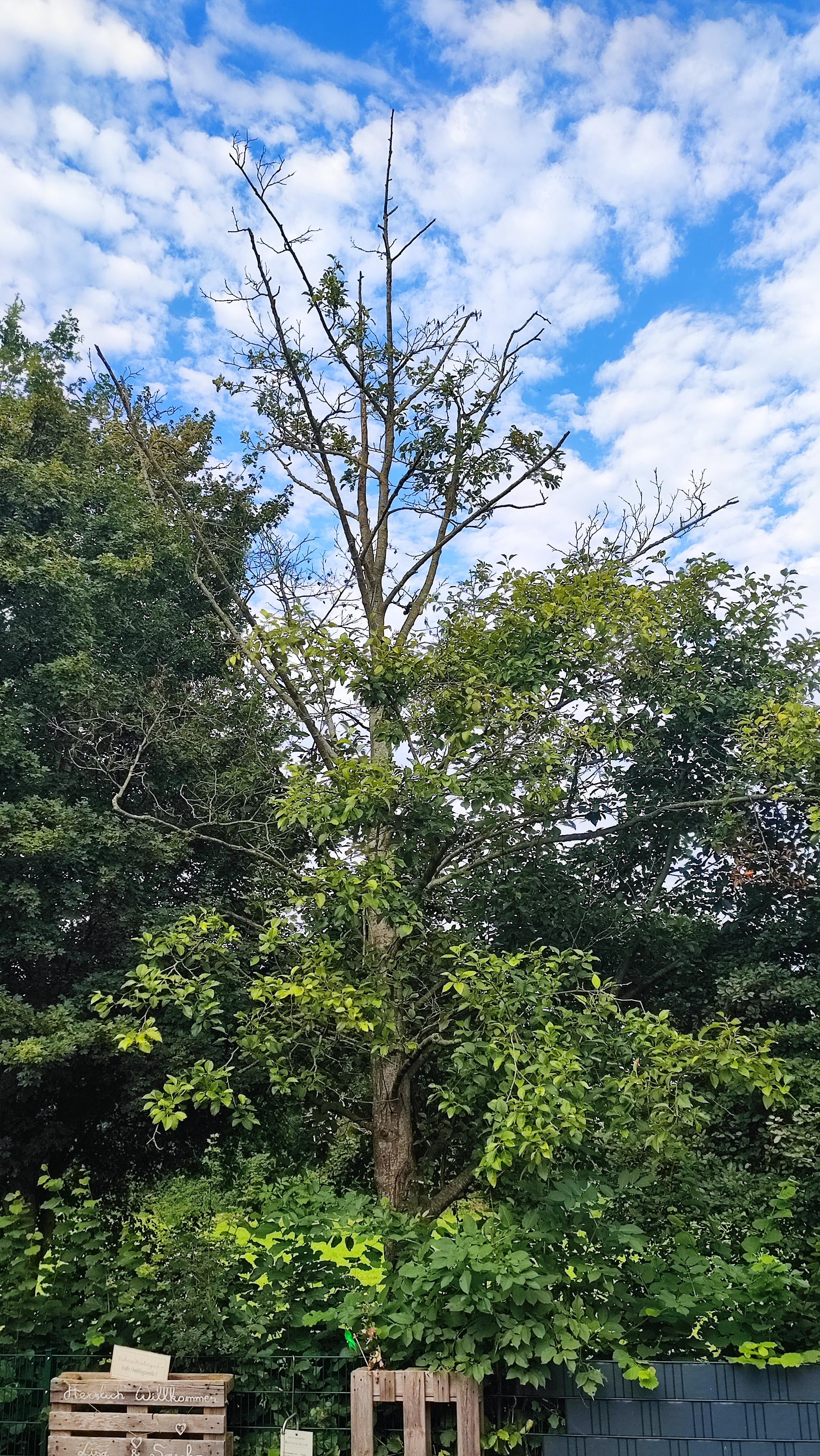 dieser Baum steht hinten auf unserem Grundstück und ich weiß nicht so recht, was ich davon halten soll. Er treibt an verschiedenen Stellen immer mal wieder aus, aber je weiter nach oben es geht, desto lichter wird es auch. Bei Wind brechen immer mal wieder relativ kräftige, aber unbeblätterte, Äste ab, die sind immer augenscheinlich tot. Ich kann keine Großartige Schädigung der Rinde oder Schädlingsbefall erkennen, hab aber von Bäumen auch nicht wirklich Ahnung. Wir wohnen erst seit zwei Jahren hier, also kann ich die Entwicklung über eine längere Zeit nicht nachvollziehen. Ich hab einfach nur keinen Bock, dass mir das Ding irgendwann in den Garten kippt. 😅