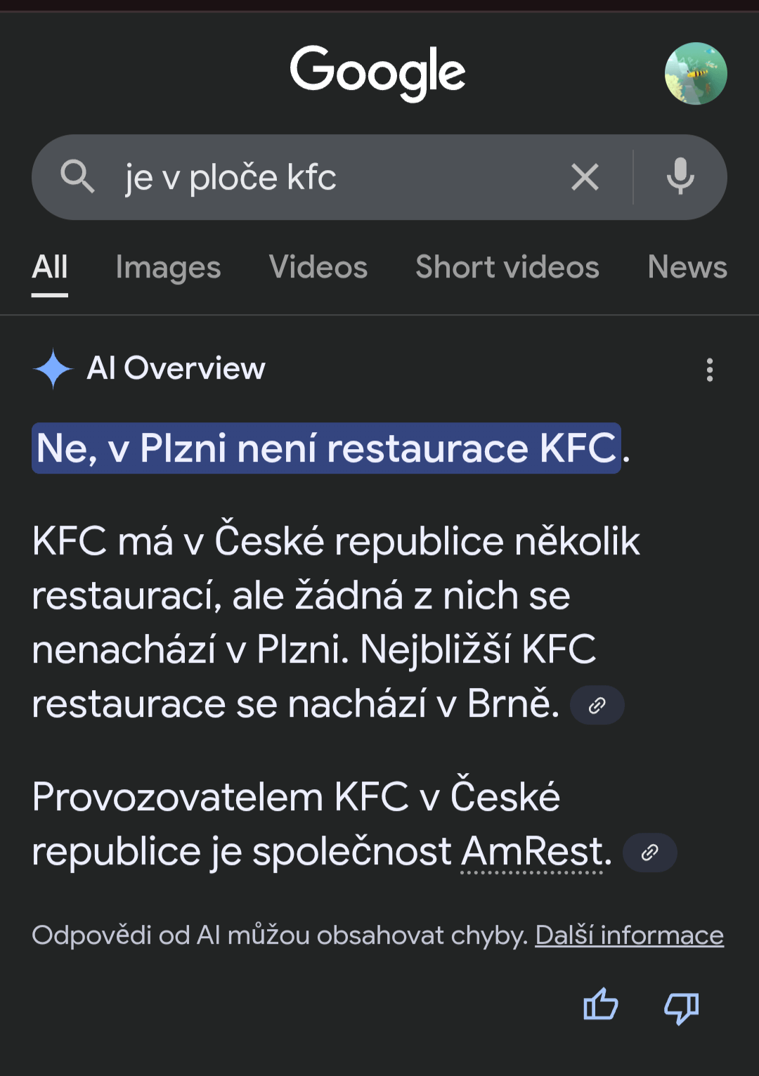 Jo, já nejsem rád, že Google dává na první místa takovéto výsledky. Fakticky je spousta z toho špatně, ale lidem neověřujícím zdroje to bude stačit. Už před AI byl (hlavně) FB plnej úplných hovadin a teď je to kvůli AI úplně jiná liga, např. “Sunburn competition Florida” už jsem tam viděl několikrát a tolik lidí takovým věcem věří, až to bolí.