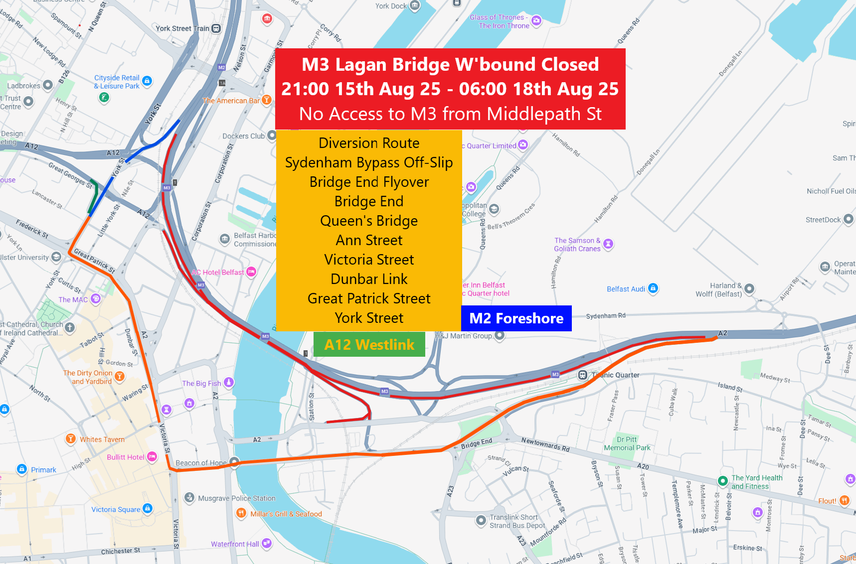 The Diversion Route is Sydenham Bypass off-slip, Bridge End Flyover, Bridge End, Queen's Bridge, Ann Street, Victoria Street, Dunbar Link, Great Patrick Street and York Street (blue route – for going back onto M2 Foreshore and Green for A12 Westlink)