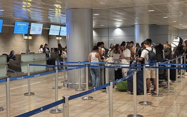 Travelers line up at the El Al check-in and security counters at Tel Aviv’s Ben Gurion Airport, on June 24, 2025. (Courtesy)