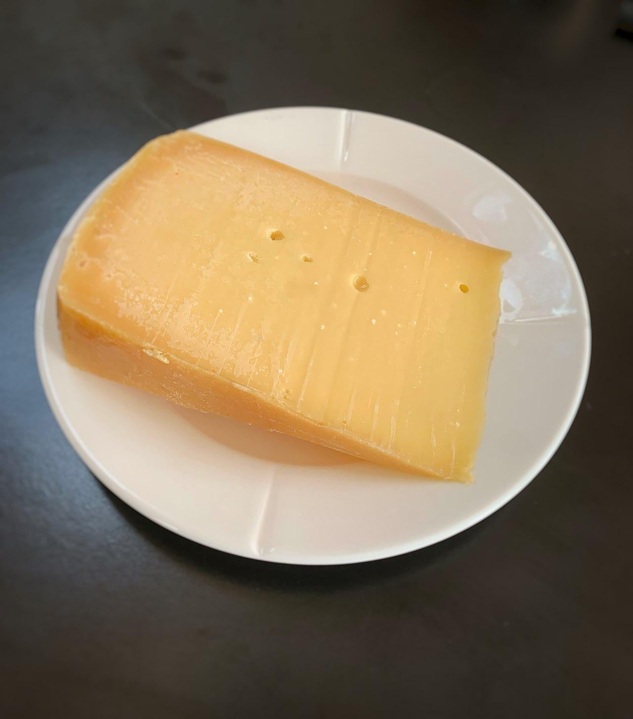 Skær omkring en centimeter fra den tynde top af (min hollandske mormor kaldte det altid for “ostecigaren” og man følte sig altid meget heldig hvis man fik lov til at spise den). Så stiller du den lodret, på dem brede korte kant og bruger en ostehøvler på den tynde top (hvor du lige har skåret “cigaren” fra). De første skiver bliver lidt smalle, men derefter fungerer det fint.