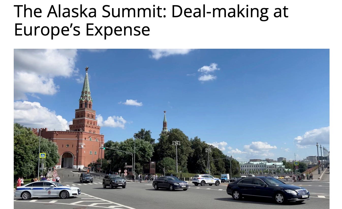 The Alaska Summit. The much anticipated Putin-Trump summit was held in Anchorage, Alaska on Friday, Alaska time. Commencing with the ceremonial reception of the two smiling, jovial leaders (this was a war summit right?), handshakes, and a flyover, Trump and Putin soon got down to business. Fortunately, they were not left alone for a long one-on-one chat, and were supported by staff such as their respective foreign ministers.