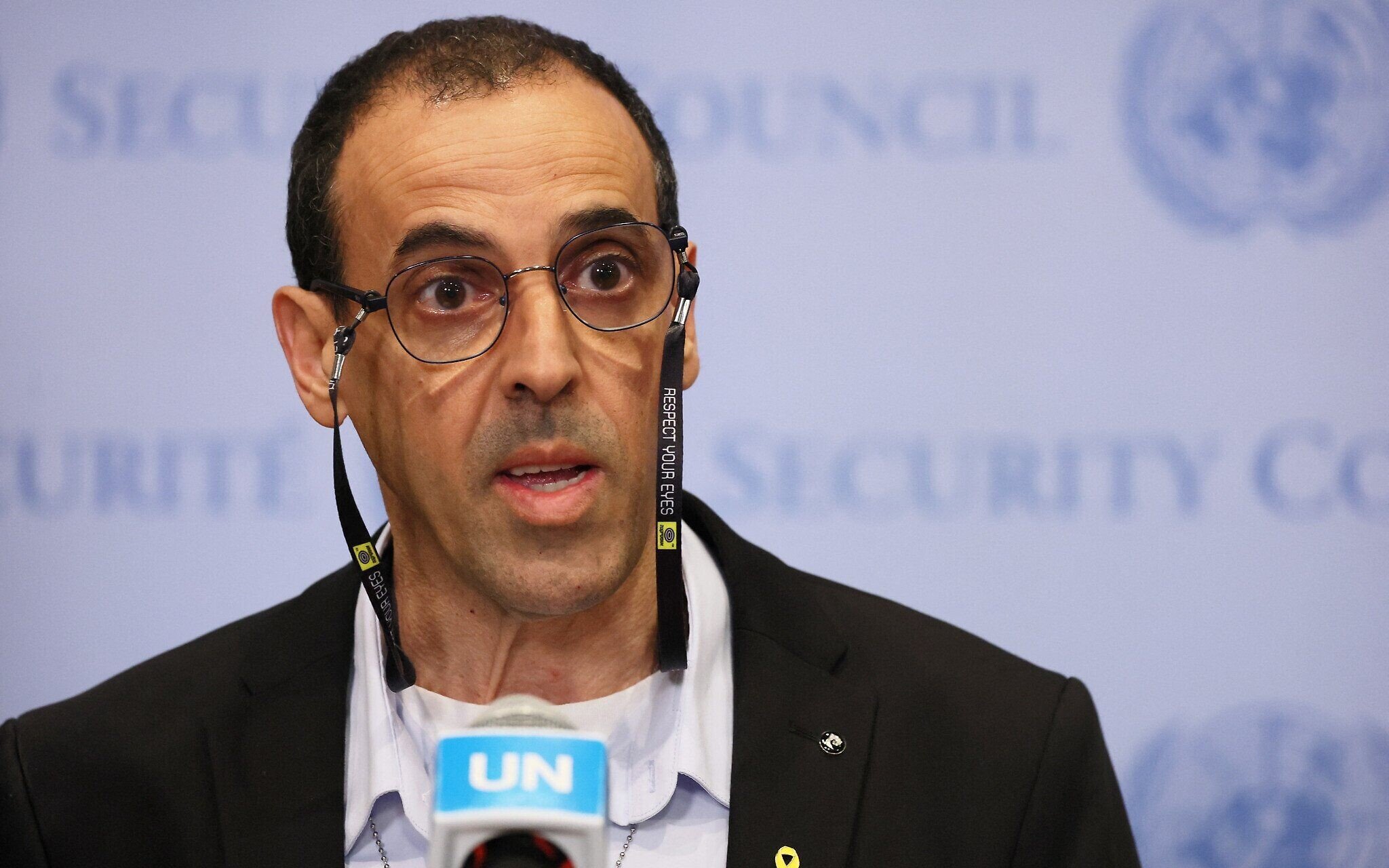 Eli Sharabi, a former hostage speaks during a press conference at the United Nations headquarters on March 20, 2025 in New York City. (Michael M. Santiago/Getty Images/AFP)