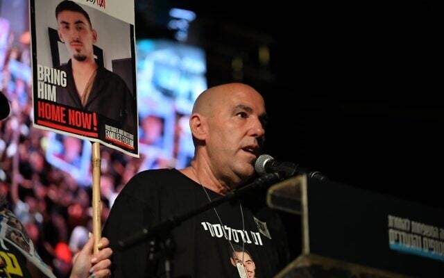 Ofir Braslavaski, father of hostage Rom Braslavski, addresses a rally at Hostages Square in Tel Aviv, August 17, 2025. (Paulina Patiner/ Hostages Families Forum)