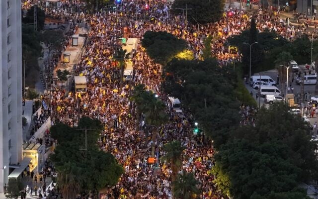 Hundreds of thousands of people crowded in central Tel Aviv on Sunday night, capping a nationwide day of protests and strikes calling on the government to end the war in Gaza and secure the release of the hostages held there by Palestinian terrorists.