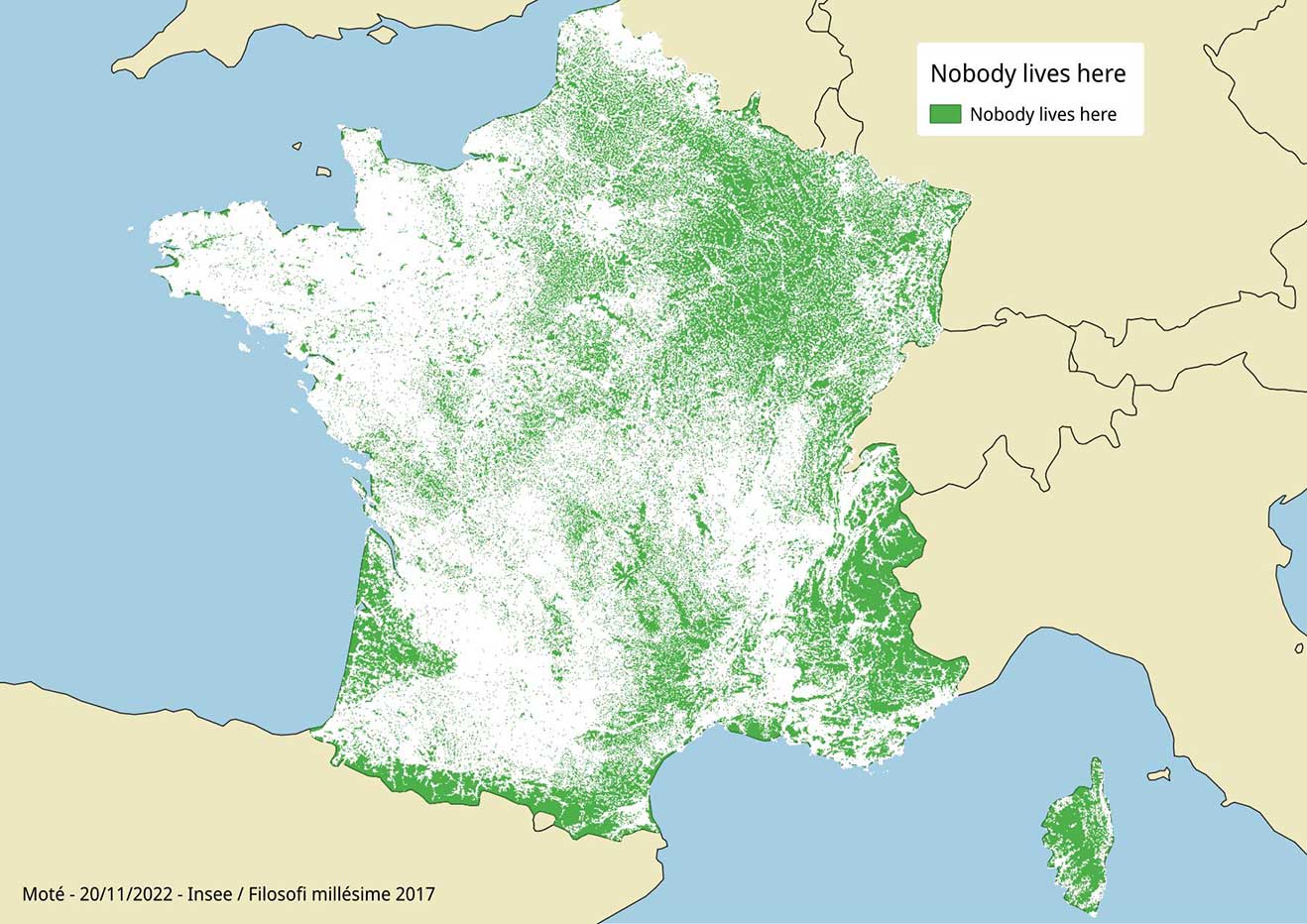 C’est moins une question de couleur de la végétation [que d’un nombre de bâtits plus faible](https://www.journaldugeek.com/app/uploads/2023/01/carte-zones-sans-habitant.jpg).