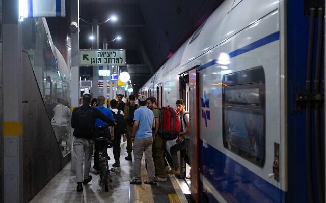 Passengers disembark at the Yitzhak Navon train station in Jerusalem on August 17, 2025. (Chaim Goldberg/Flash90)