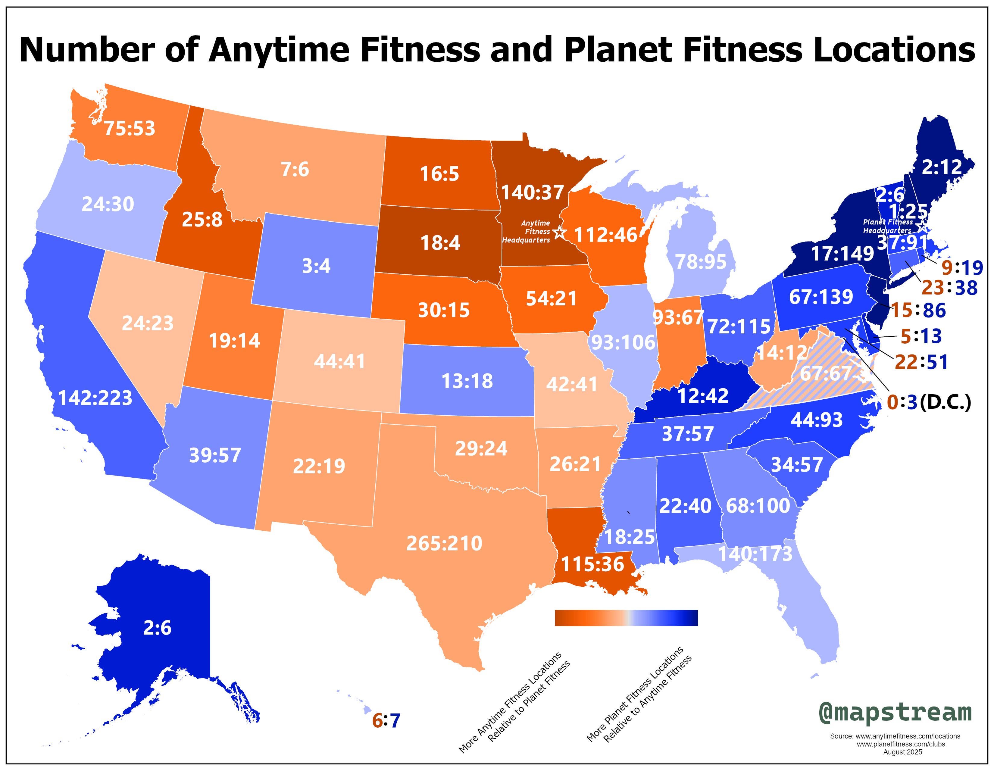 Is there an interesting conclusion to draw from this? it basically looks to me like Anytime started in MN and expanded outward. And Planet fitness somewhere in New England.