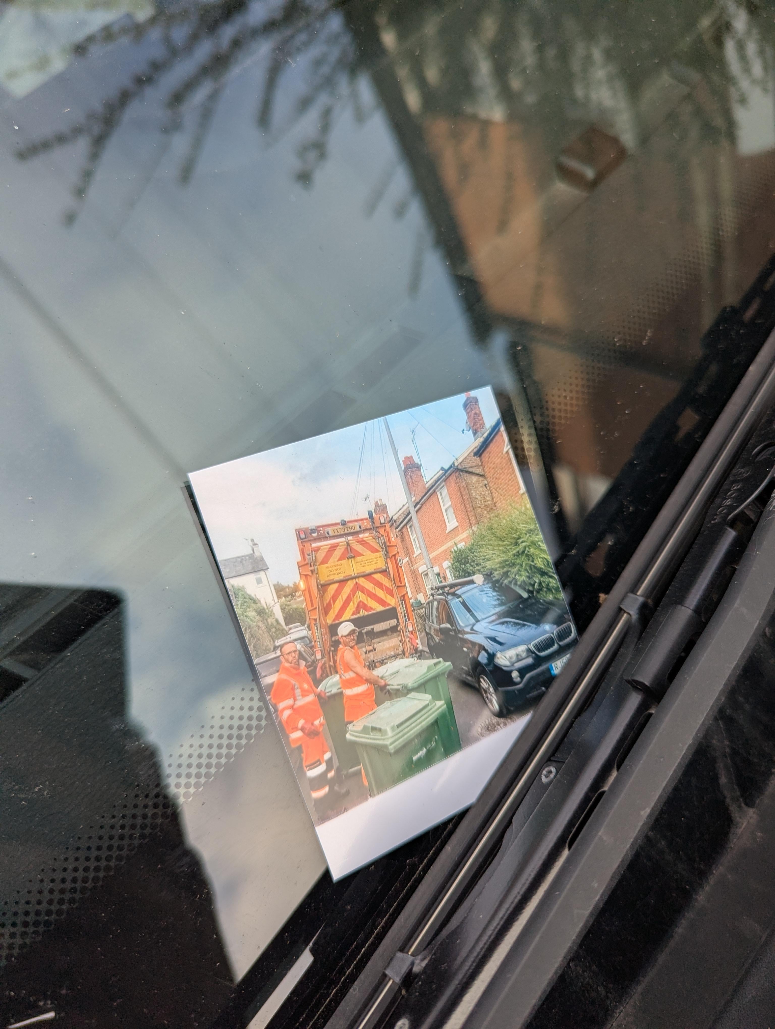A car was blocking the road this morning and the bin men couldn’t get through. Instead of a note there is a photo of the moment of inconvenience instead.