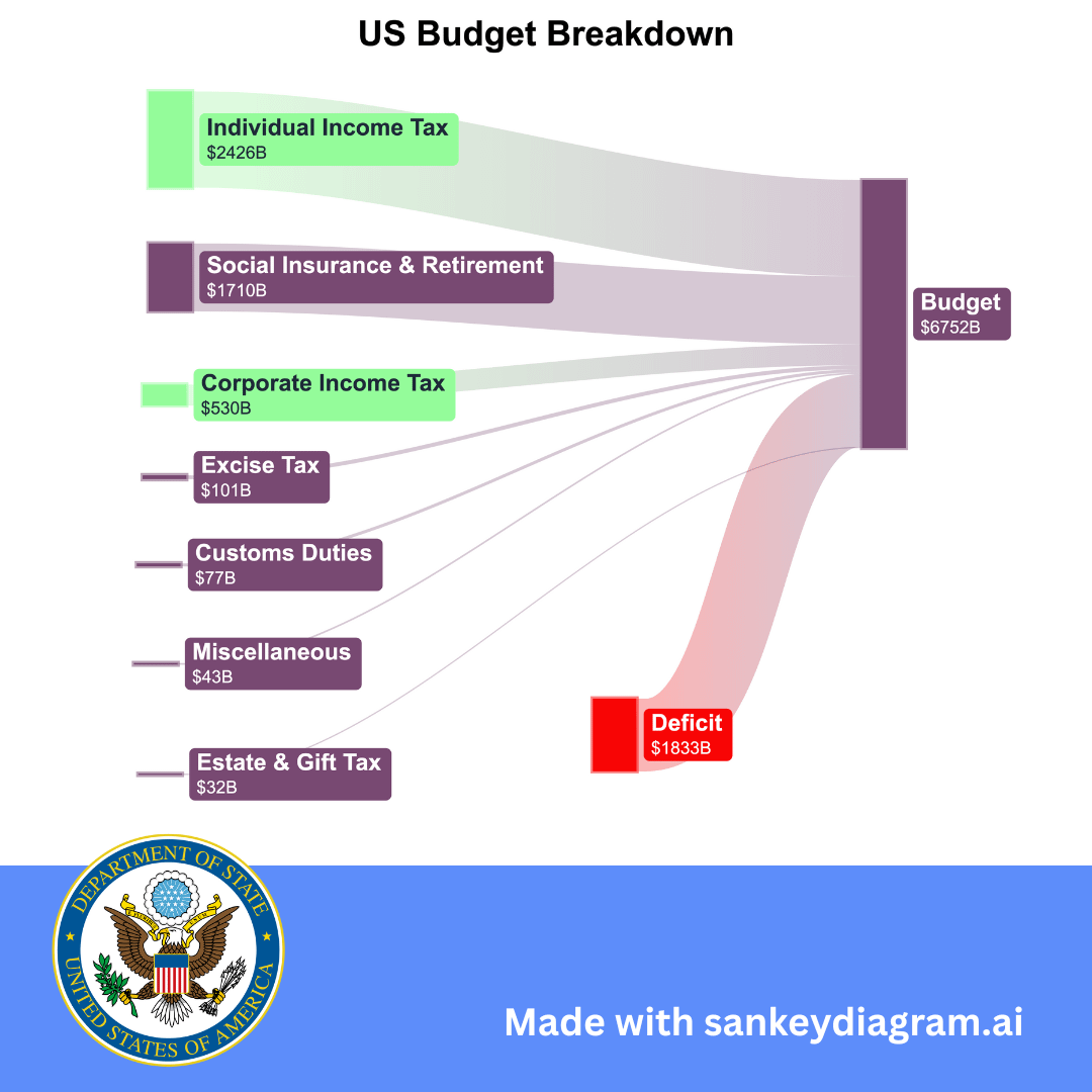 This Sankey diagram shows revenue and spending so you can see the full lifecycle of a dollar: [https://usafacts.org/articles/this-chart-tells-you-everything-you-want-to-know-about-government-spending/](https://usafacts.org/articles/this-chart-tells-you-everything-you-want-to-know-about-government-spending/)