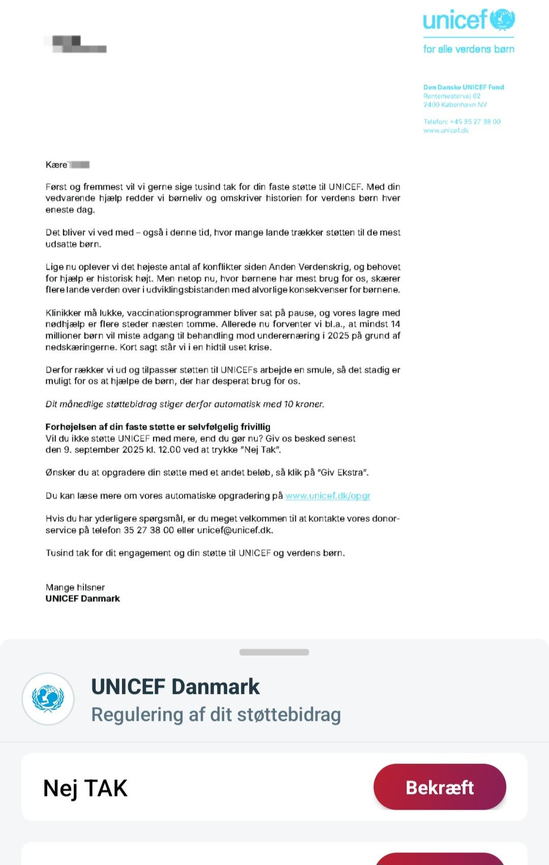 Opslaget her er mest tænkt som information til andre Unicef-støtter, men en debat om praksissen er nok uundgåelig. Og lad mig selv gribe den med det samme – nej, jeg synes ikke det er sammenligneligt med streamingtjenester og andre abonnementer, der også automatisk hæver prisen i ny og næ. Jeg køber ikke et produkt, jeg giver penge af mit gode hjerte, og jeg føler at det bliver groft udnyttet med de her metoder. Har aldrig prøvet noget lignende hos andre organisationer.