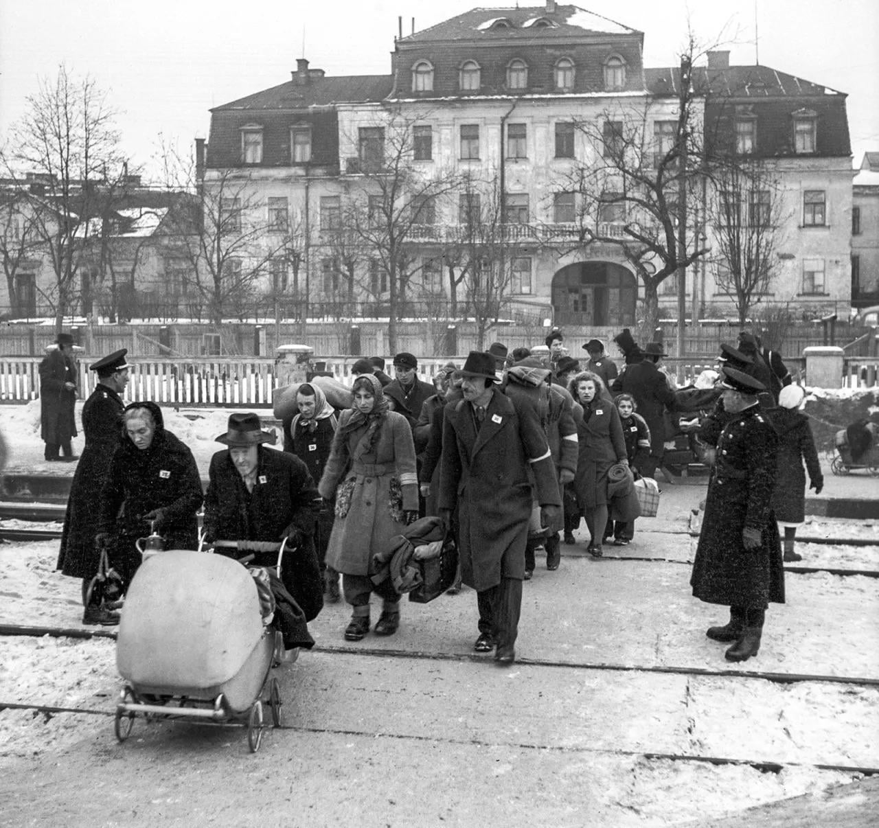 Photo of postwar deportations of ethnic Germans from Czechoslovakia. They wear an “N” on their clothes that stands for “Němec,” which means German. (January 1946)(1280×1206)