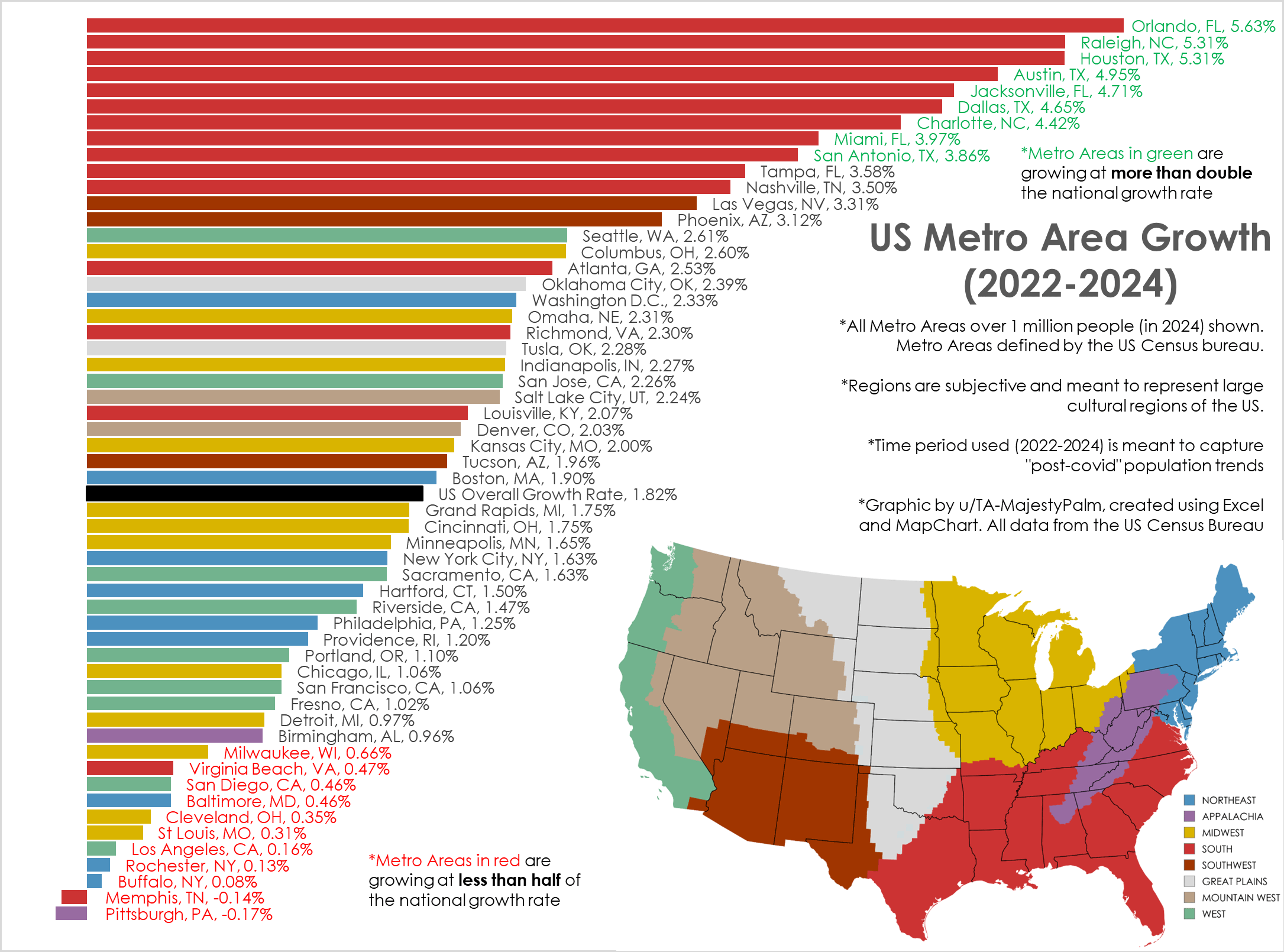 Graphic by me, created in Excel. All data from US Census here: https://www.census.gov/data/tables/time-series/demo/popest/2020s-total-metro-and-micro-statistical-areas.html