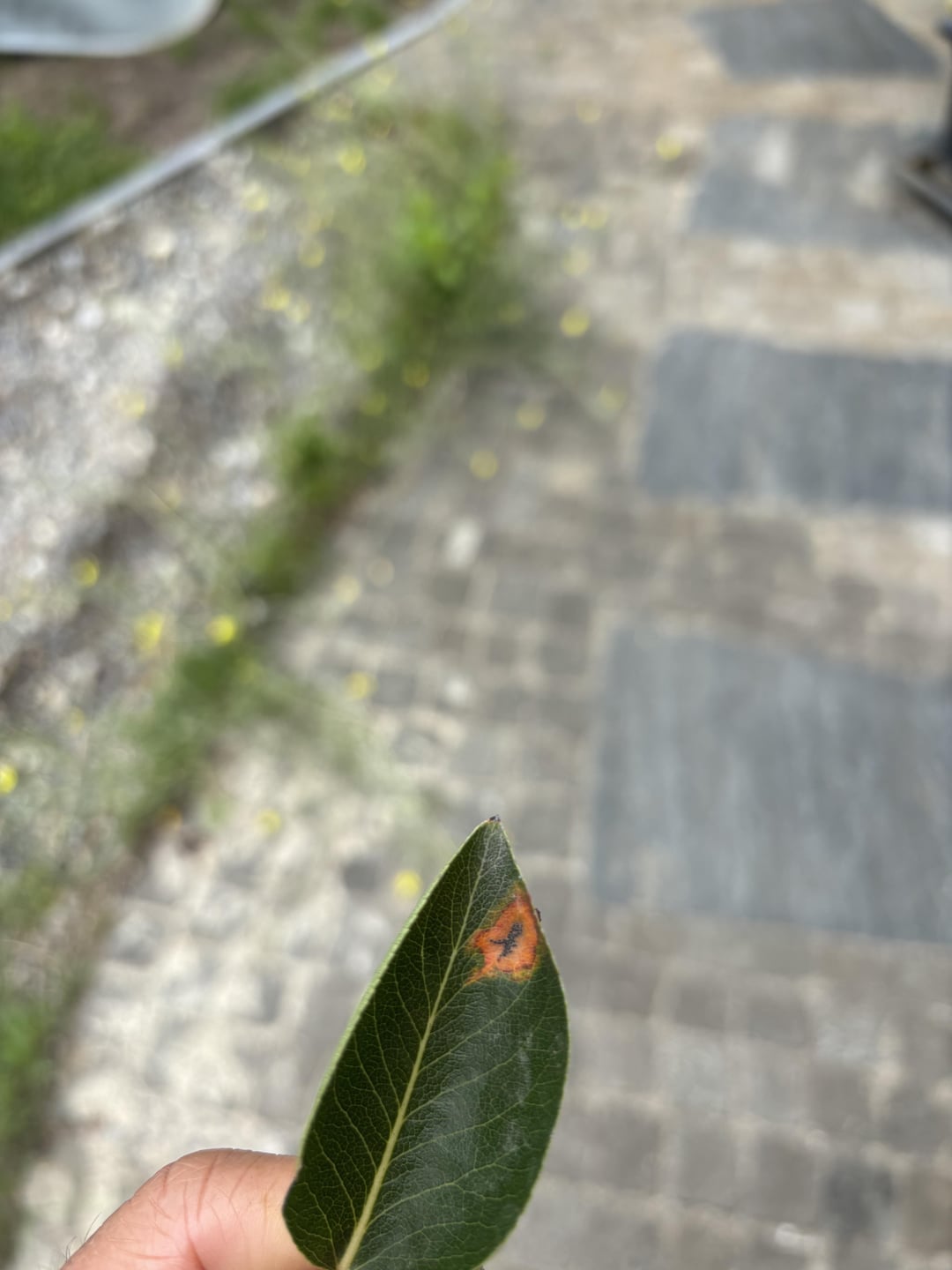 Birnengitterrost. Eine Viruserkrankung die durch die Luft übertragen wird. Zwischenwirt sind Wacholderpflanzen.