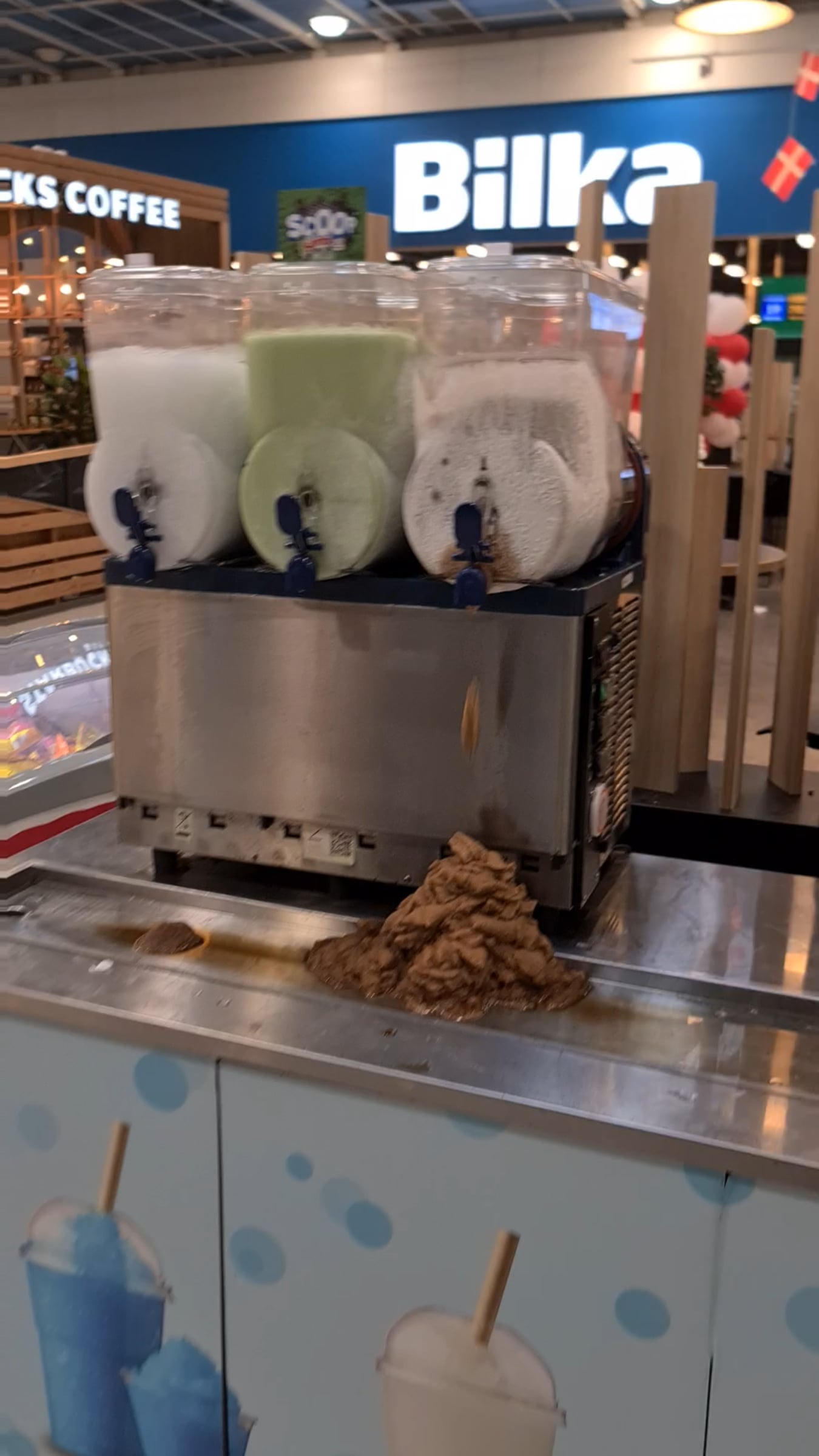 Er det i Kolding Storcenter? Den har faktisk gjort det før. Er engang gået forbi hvor der sprøjtede rød slushice ud over det hele. Fatter ikke hvorfor de ikke køber en ny eller får den fikset