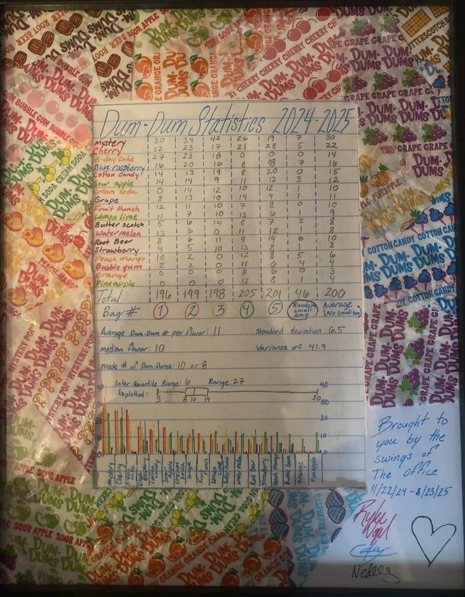 My coworkers and I have been keeping track of data for bags of dum-dums we’ve bought for the office. It’s my last day, and this is the memorial for the end of our math. Hope you enjoy!