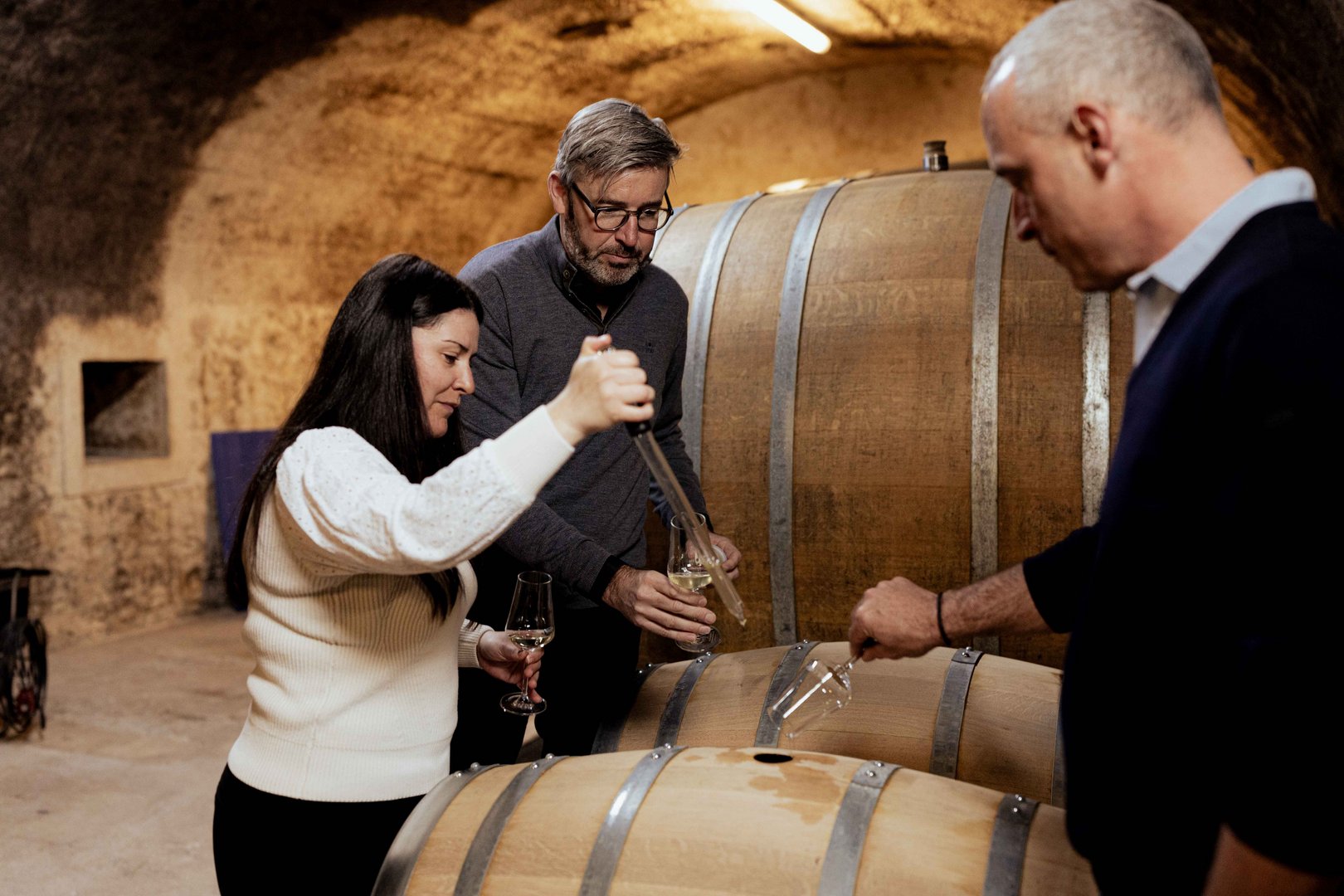 Kellermeisterin Charlène Muller probiert mit André Mehlen und Josy Gloden im Weinkeller