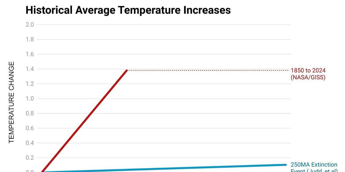 The graph is confusingly labeled. What are the units of the x-axis? I know the units should be degrees Celsius, but that’s not a temperature change, that’s a temperature. Temperature change should have units of degrees Celsius per year, or some other equivalent unit. Otherwise, reading the graph we may think that the temperature changed by 0.2, then by 0.4, then by 0.6, and so on, and we would have to take the definite integral of that curve from t = 0 to t = 150 to get the change in temperature. I see what you are trying to do, which is put our current climate change in perspective with the rest of Earth’s climate history, and we do need ways to put that in perspective that people can see, because people do not seem to be able to see it.