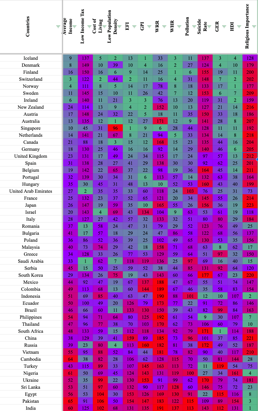 My sheets document includes the sources, but the ranking uses 13 different sources. Sadly, not every country is included in every source so you will see blank spaces for countries that are left out in the data. I've also created a correlation index to see how different metrics matched up with each other and you can see the data I used for each ranking.