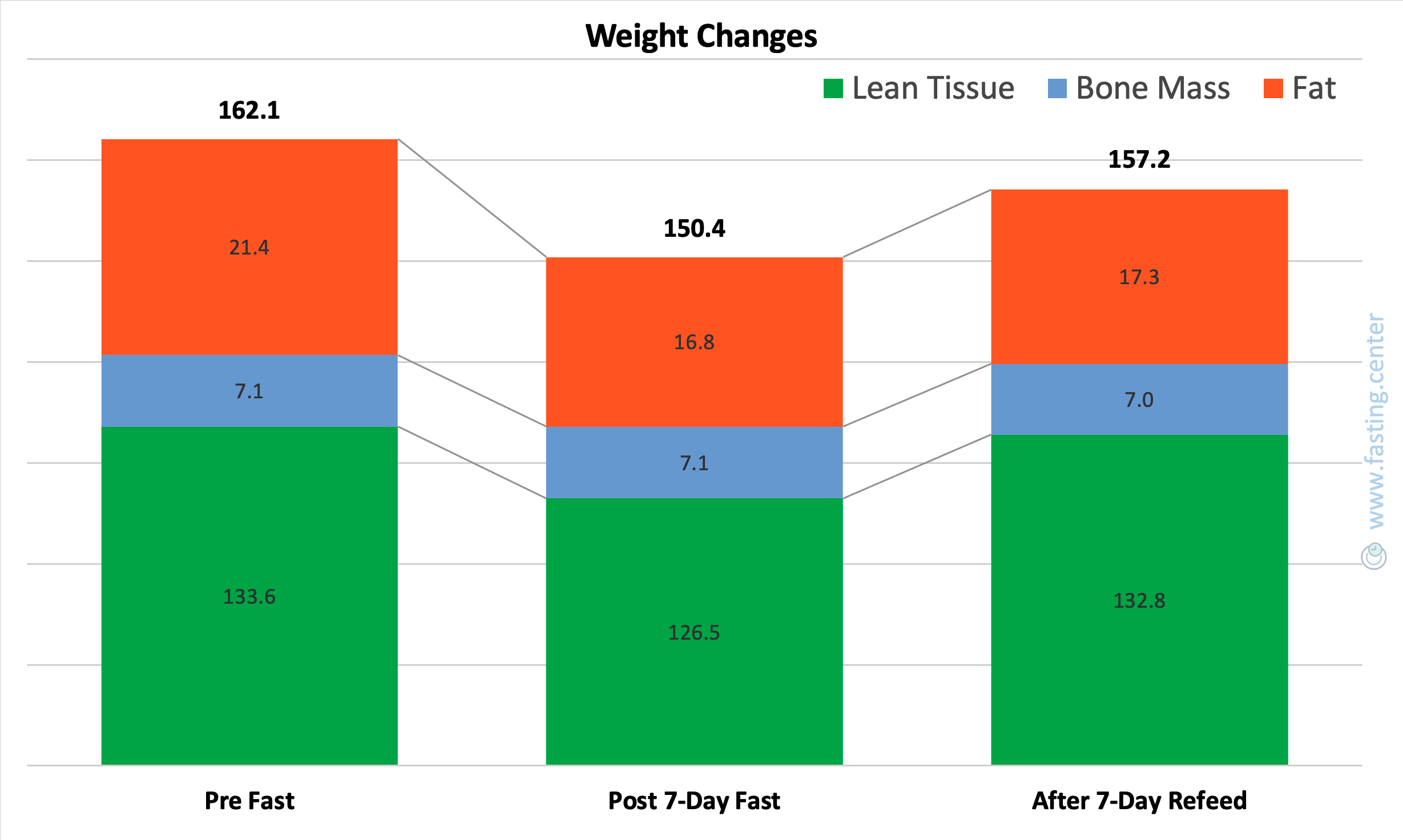 - Lean tissue dipped during the fast but mostly came back after refeed.